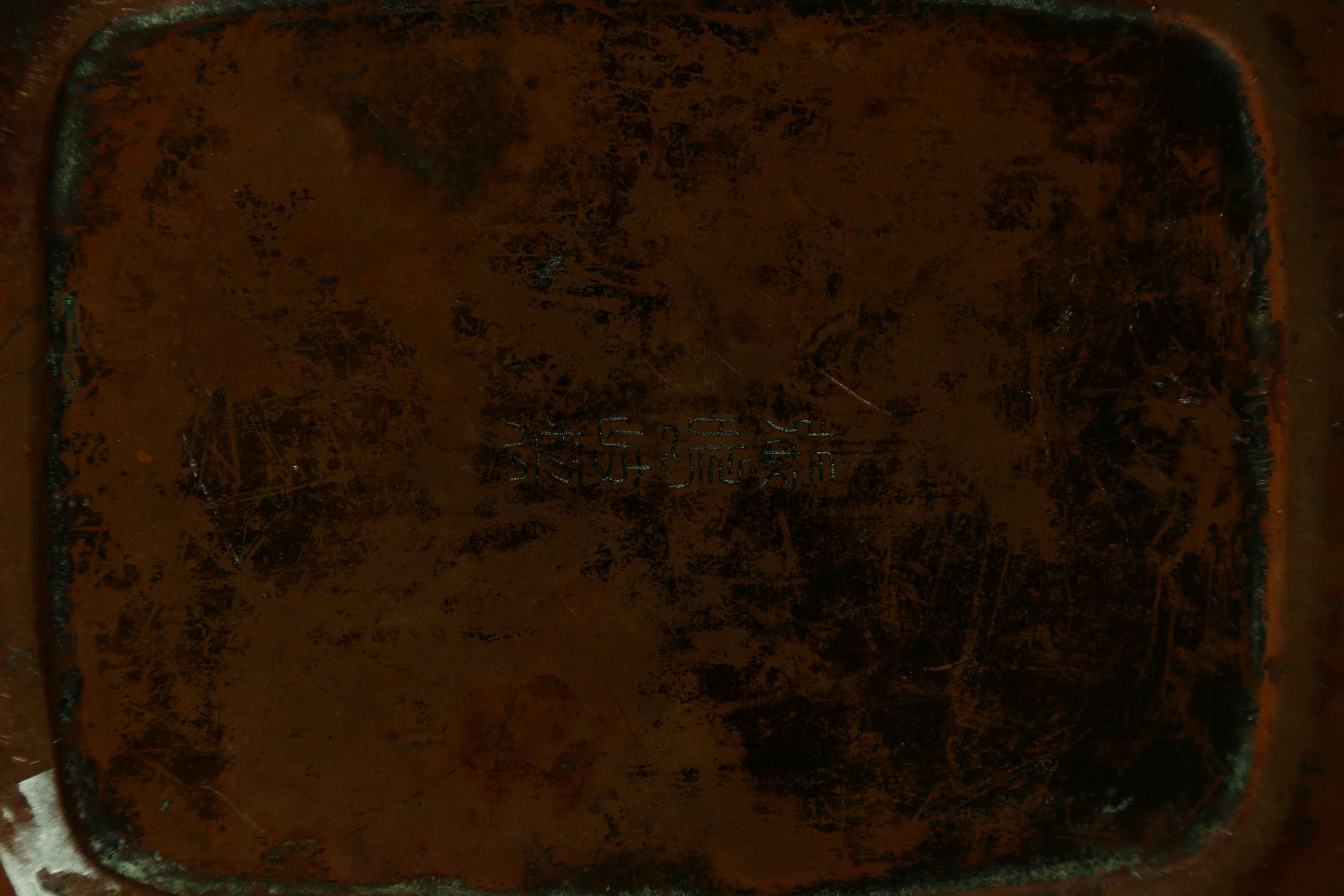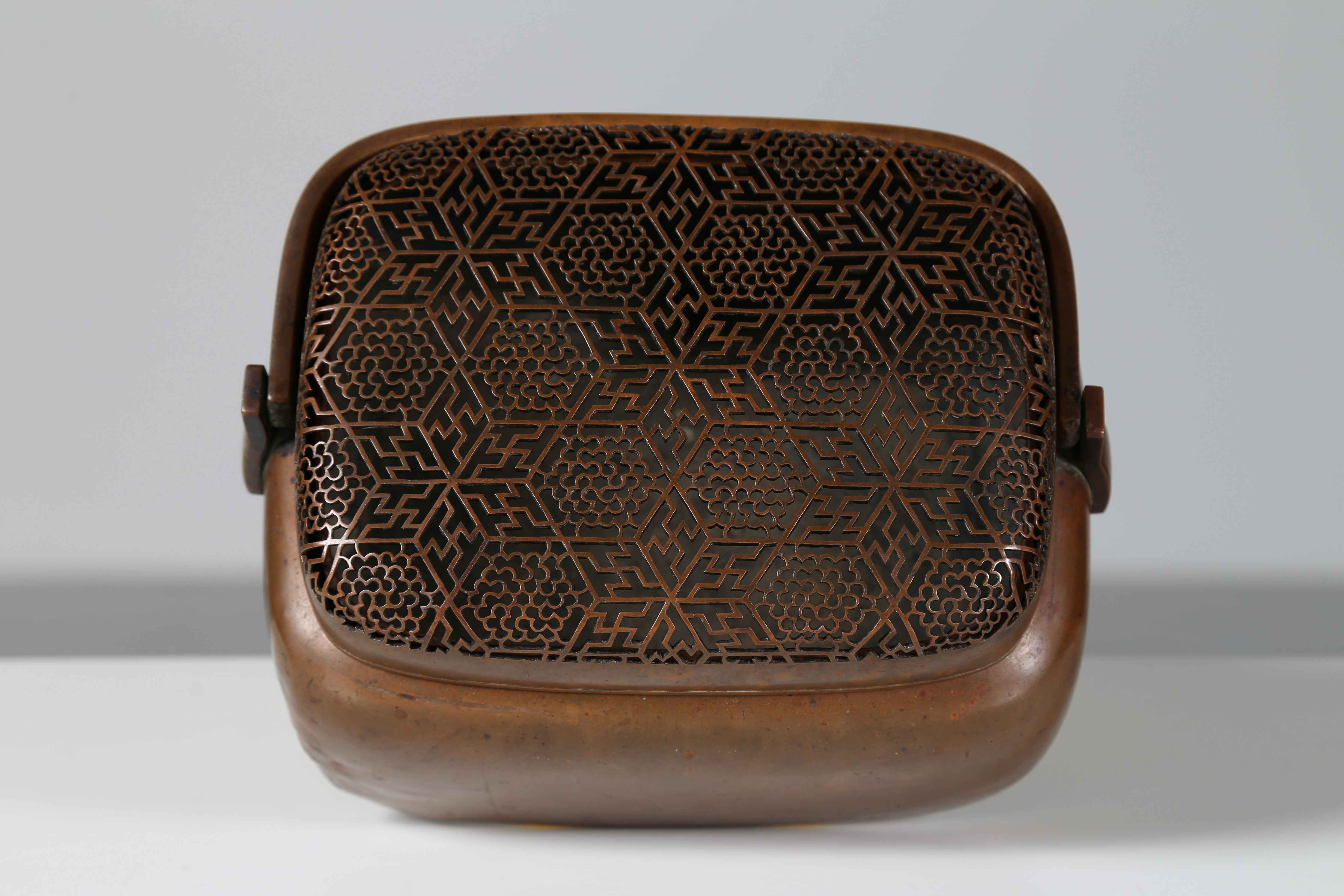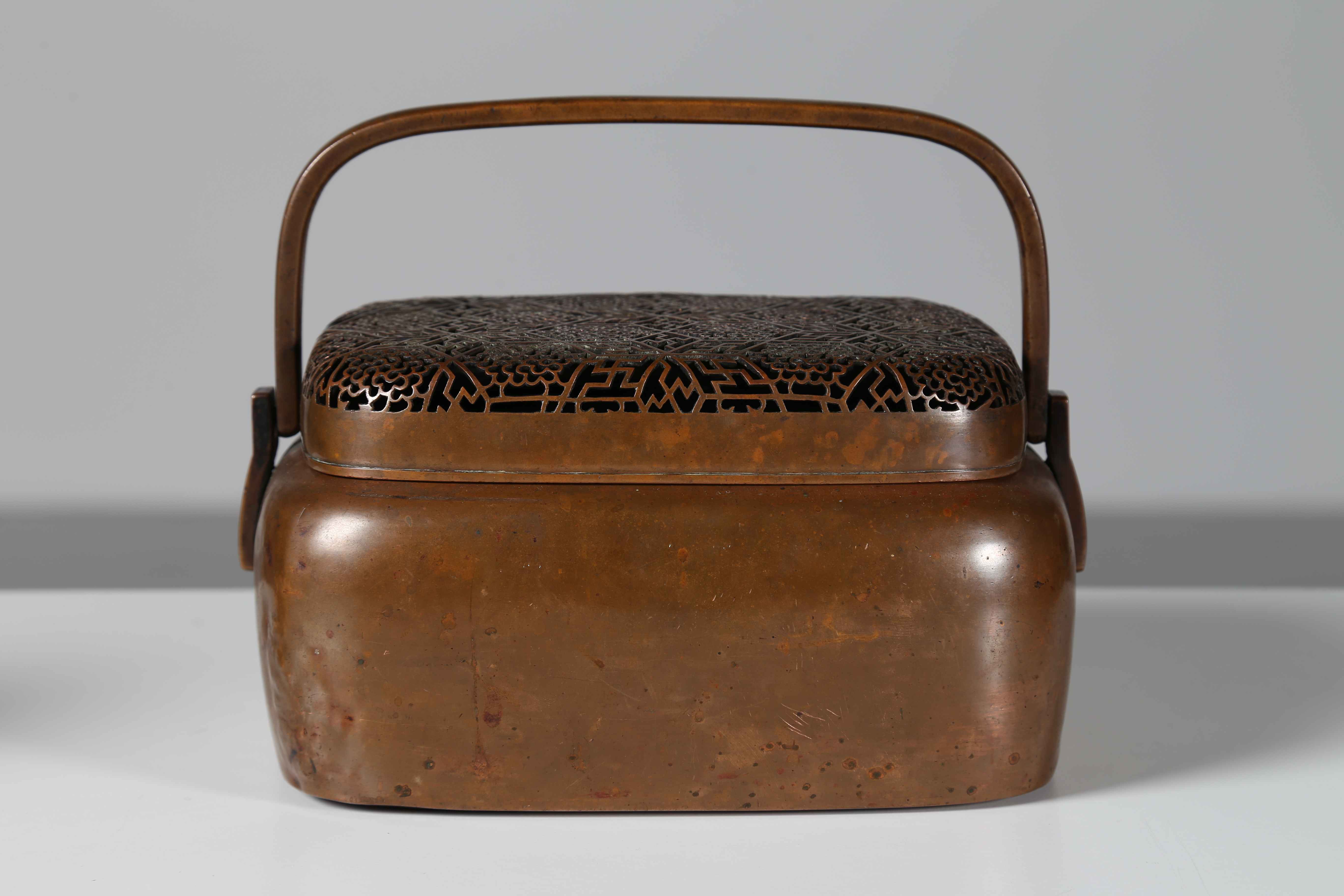 Arte Cinese Scaldamani in bronzo a patina marrone con marchio Zhang Ming Qi Cina, tarda dinastia Ming, XVII secolo. . Cm 24,00 x 13,00. Scaldamani rettangolare con manico e coperchio traforato decorato con intricato motivo geometrico, Marchio inciso in linea sulla base.