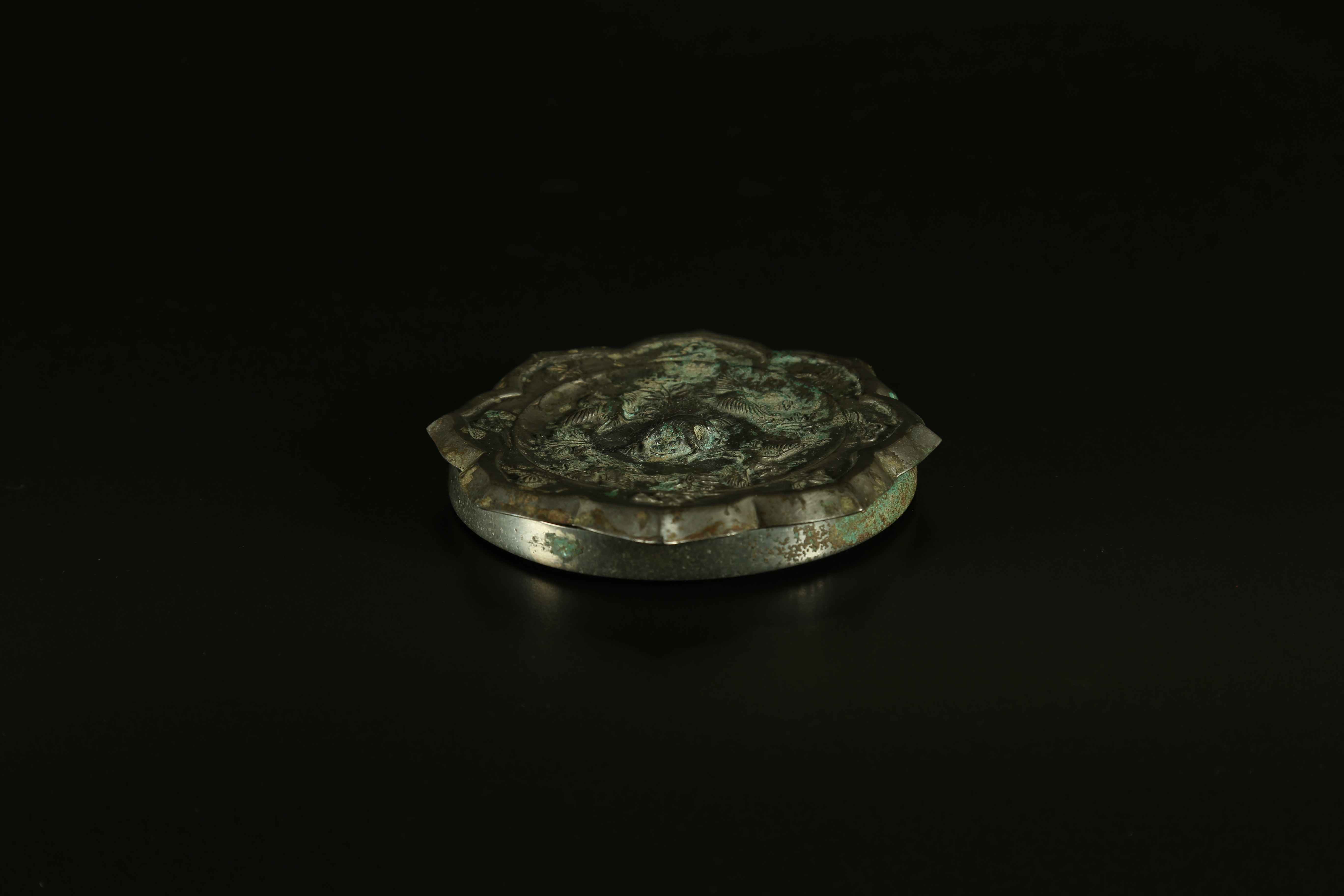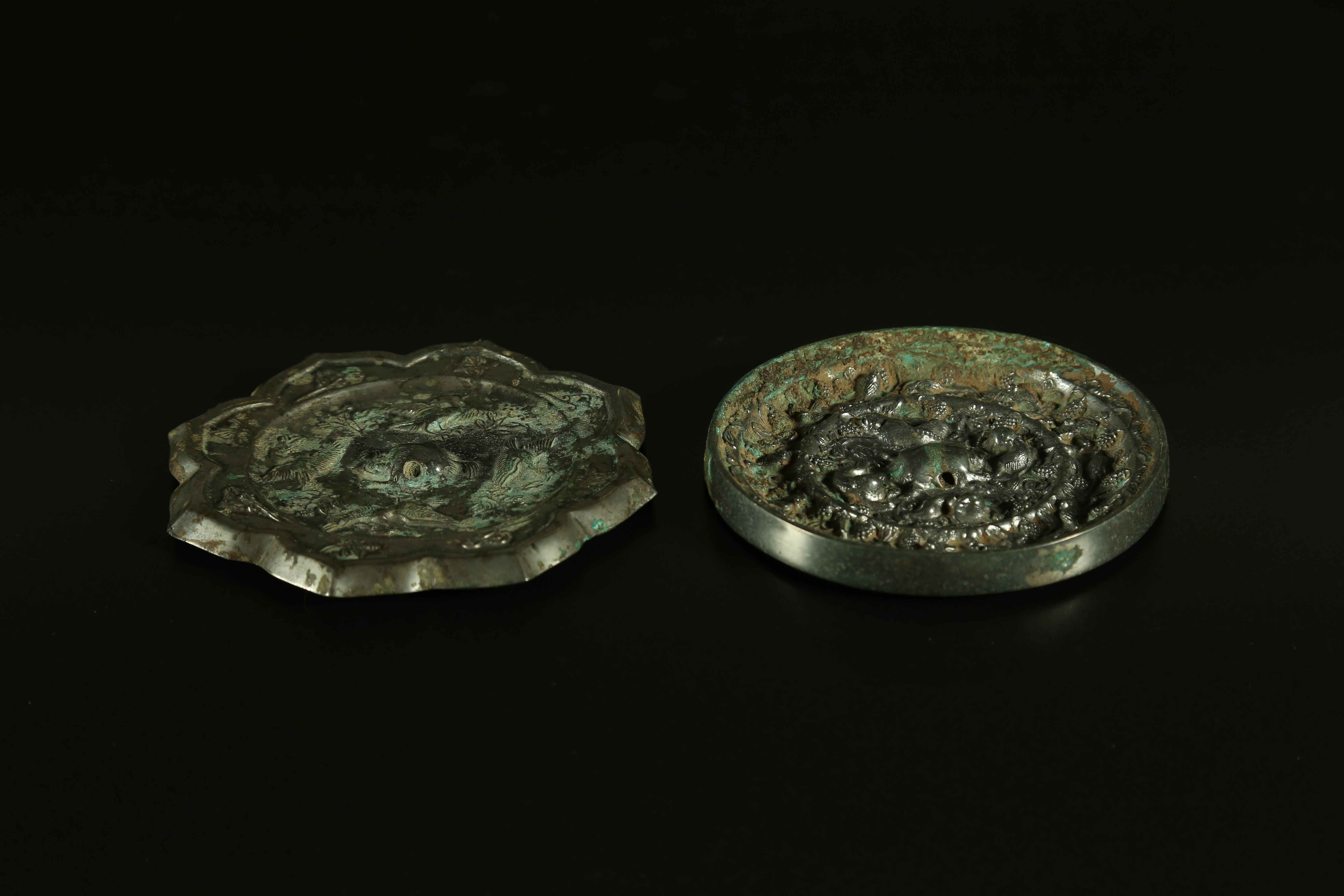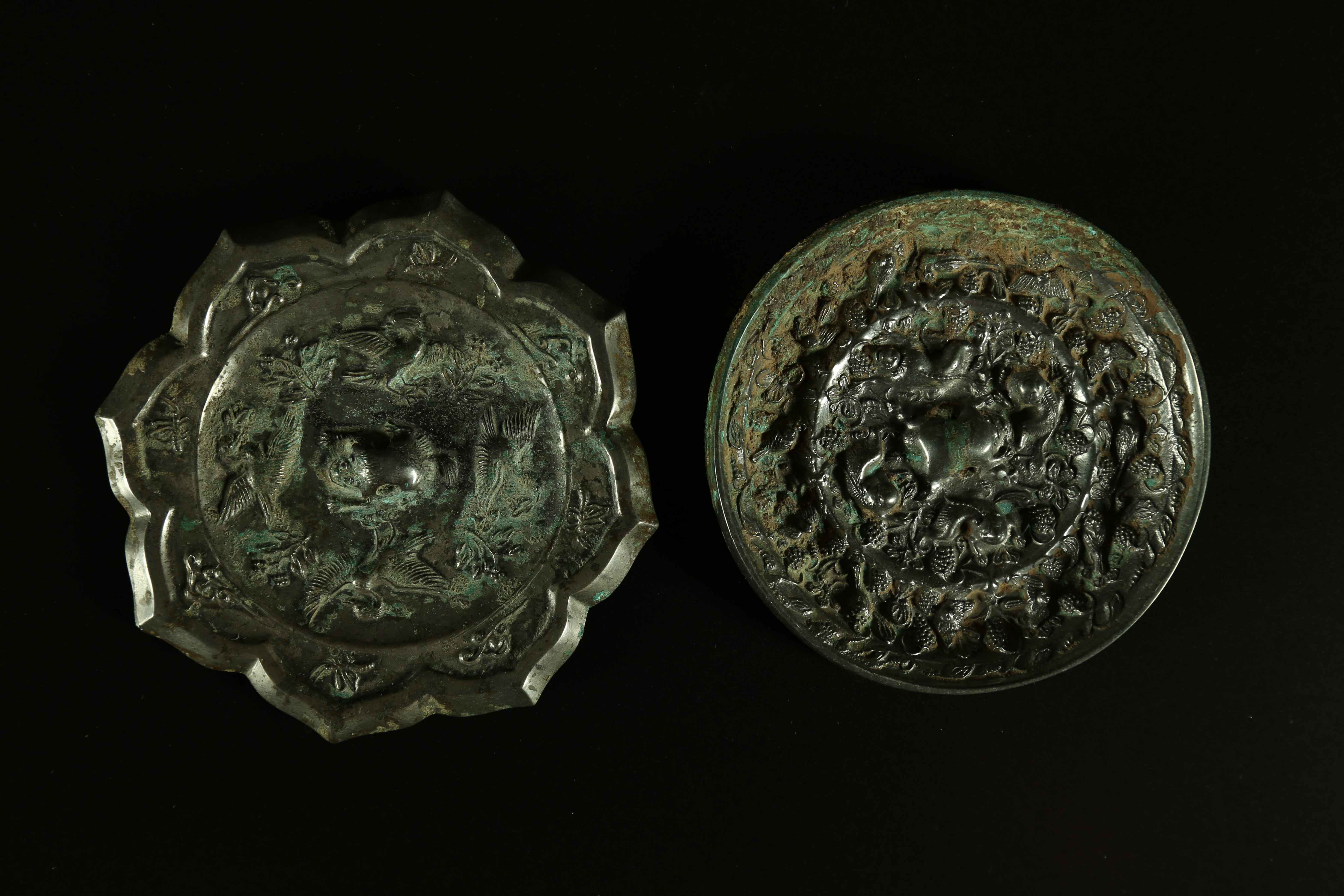 Arte Cinese Coppia di specchi in bronzo Cina, dinastia Tang (?), VII - IX secolo. -. Cm 12,00. Uno presenta bordi lobati e decorazione di gru volanti (diam. 12 cm) , l'altro tondo raffigura scoiattoli, uccelli e grappoli d'uva (diam. 11 cm).