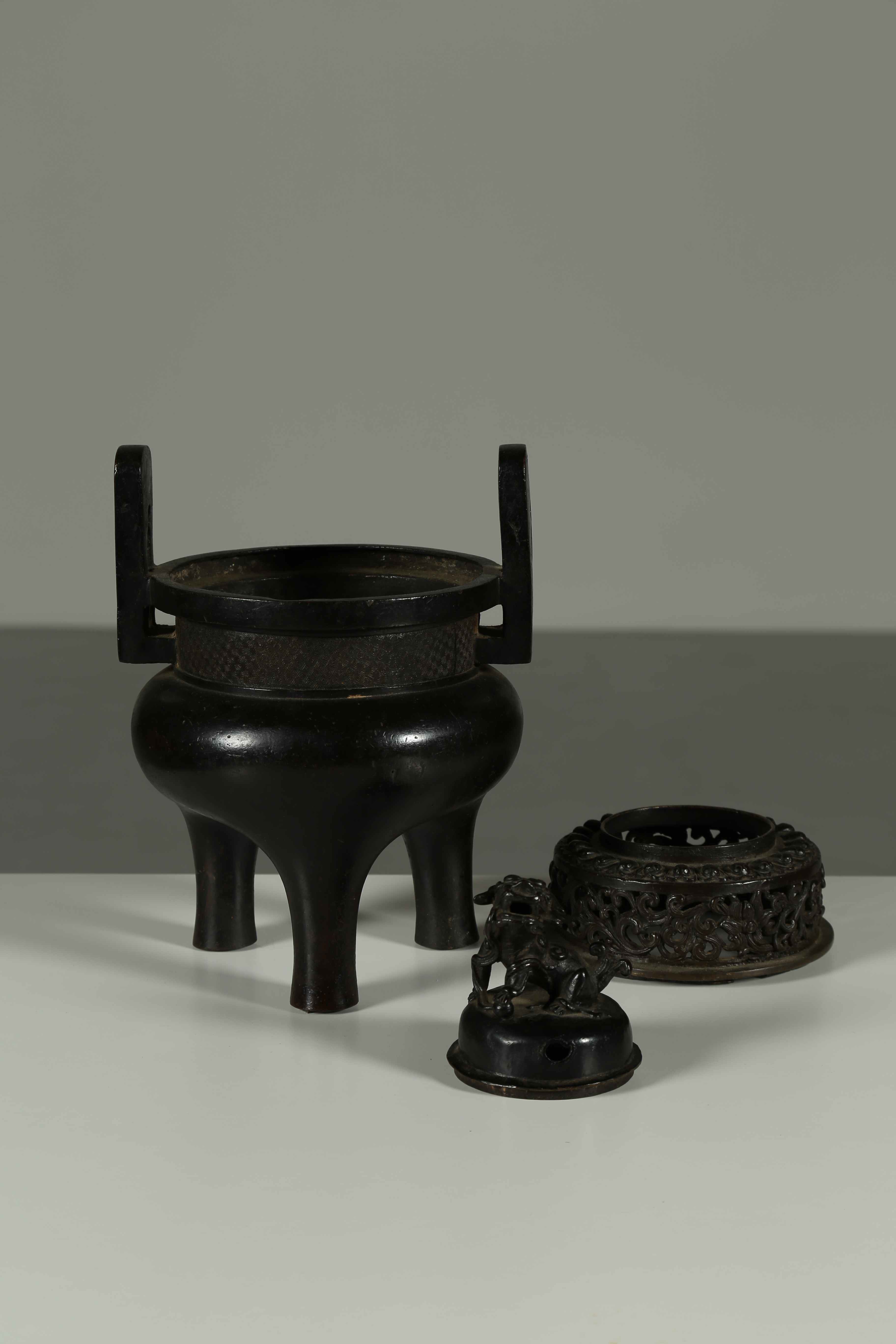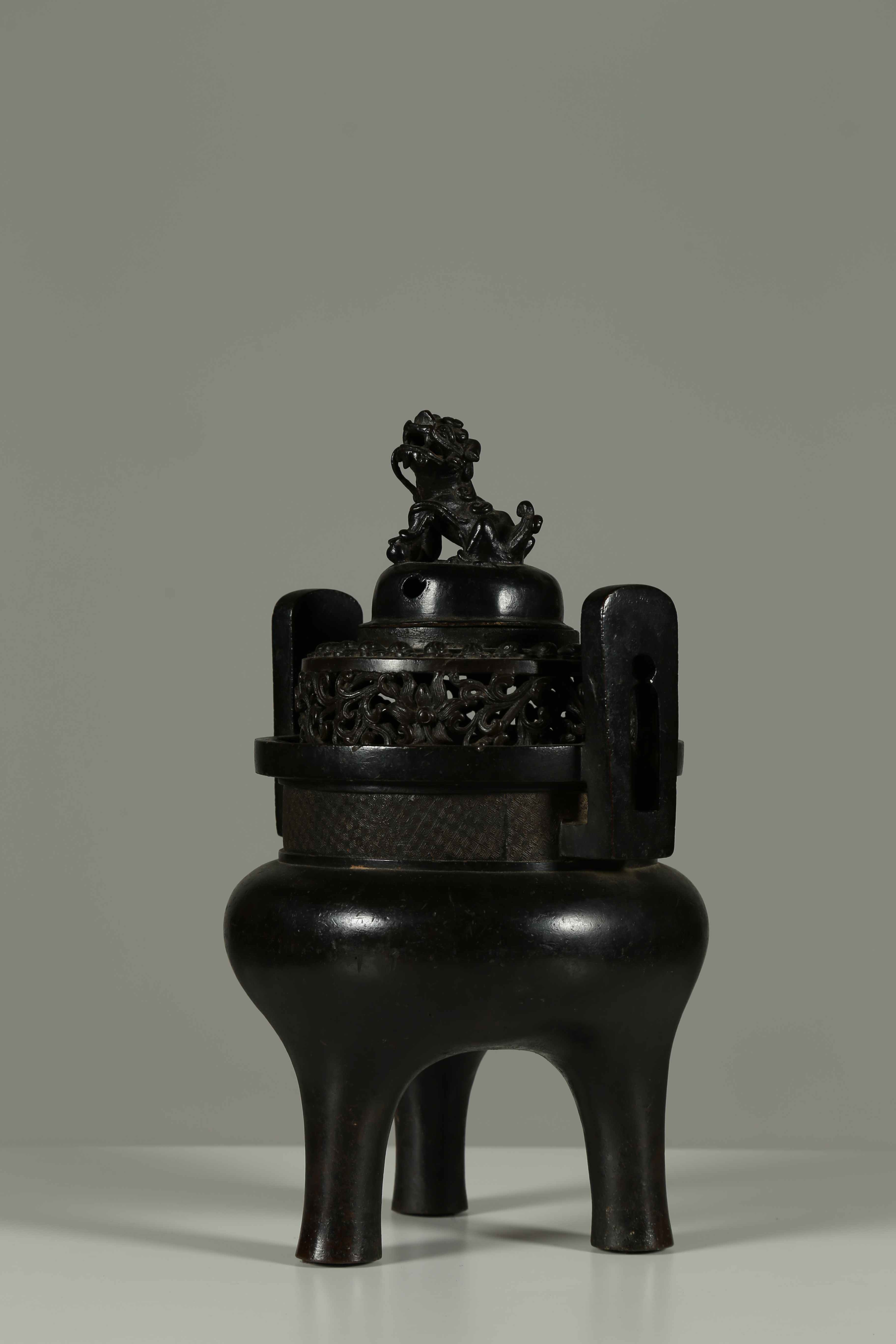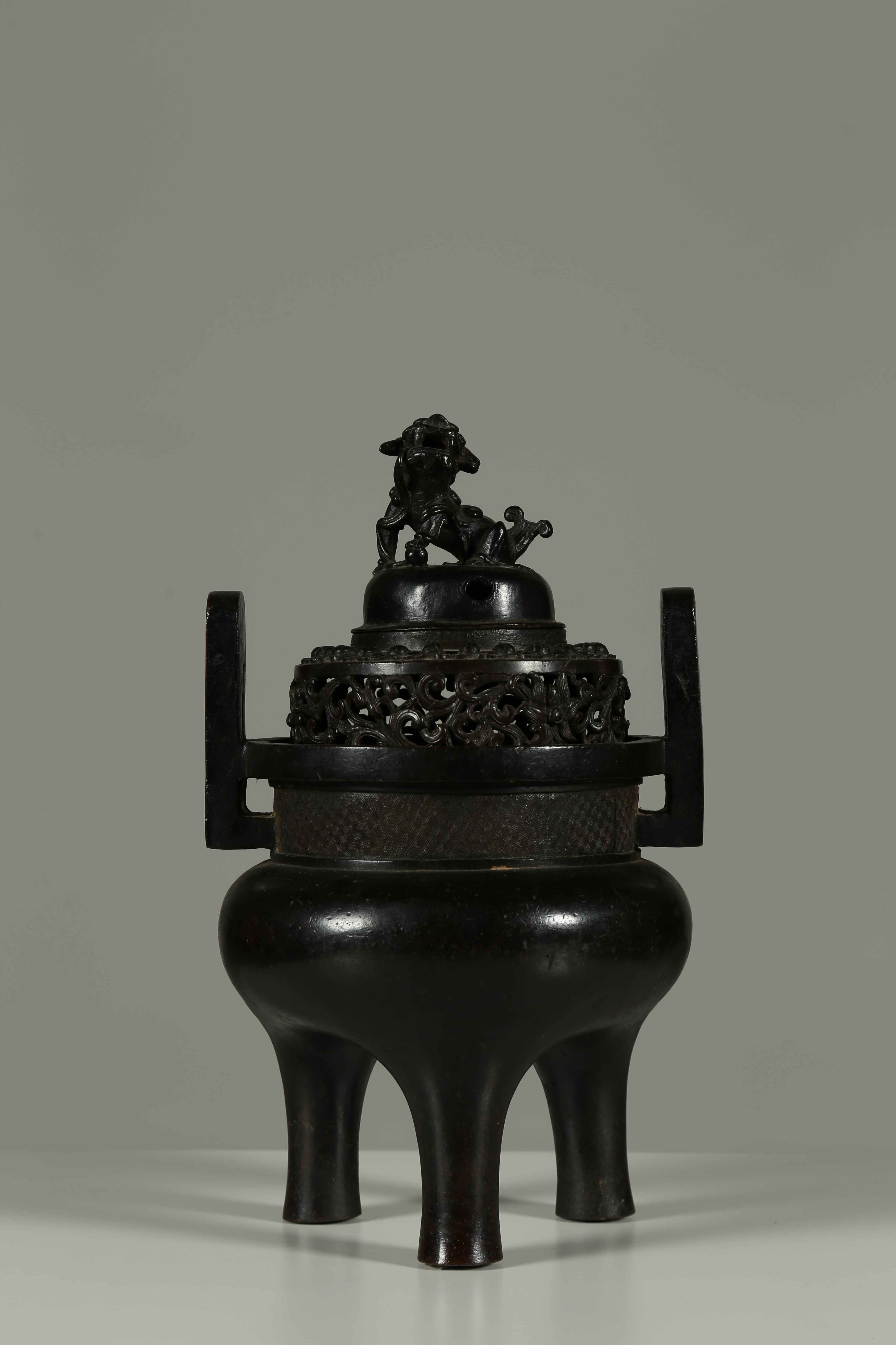 Arte Cinese Incensiere tripode in bronzo Cina, dinastia Ming. -. Cm 23,50 x 40,00. Pesante fusione in bronzo dalla tipica forma tripode con lunghe anse e completo di coperchio lavorato a traforo con motivi vegetali e recante impugnatura a forma di cane di Pho.