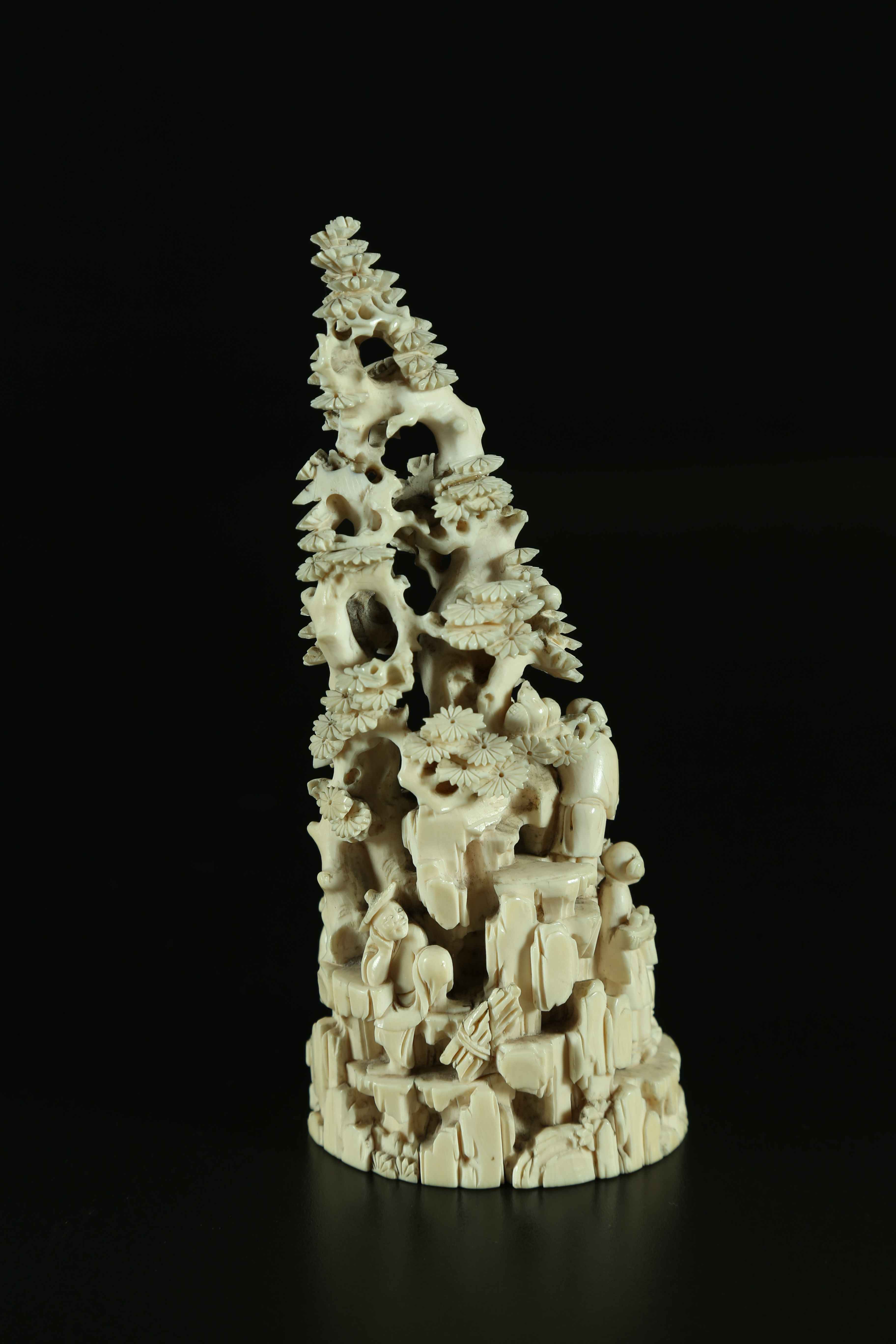Arte Cinese Intaglio in avorio raffigurante una montagna e delle figure Cina, XVIII . . Cm 7,50 x 17,00. Di struttura piramidale con figure ingaggiate in diverse attività sulla base ed un albero con uccelli sulla sommità