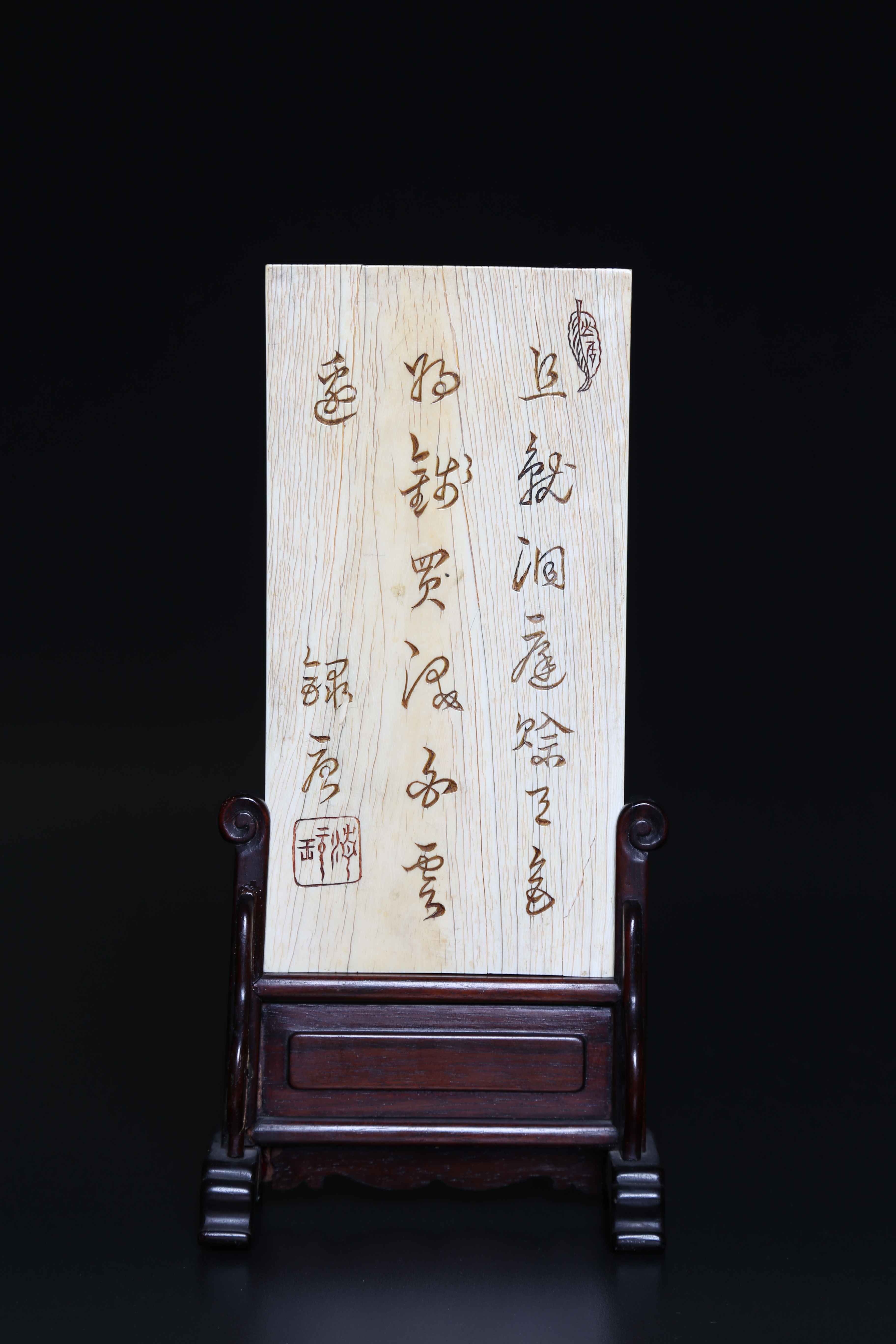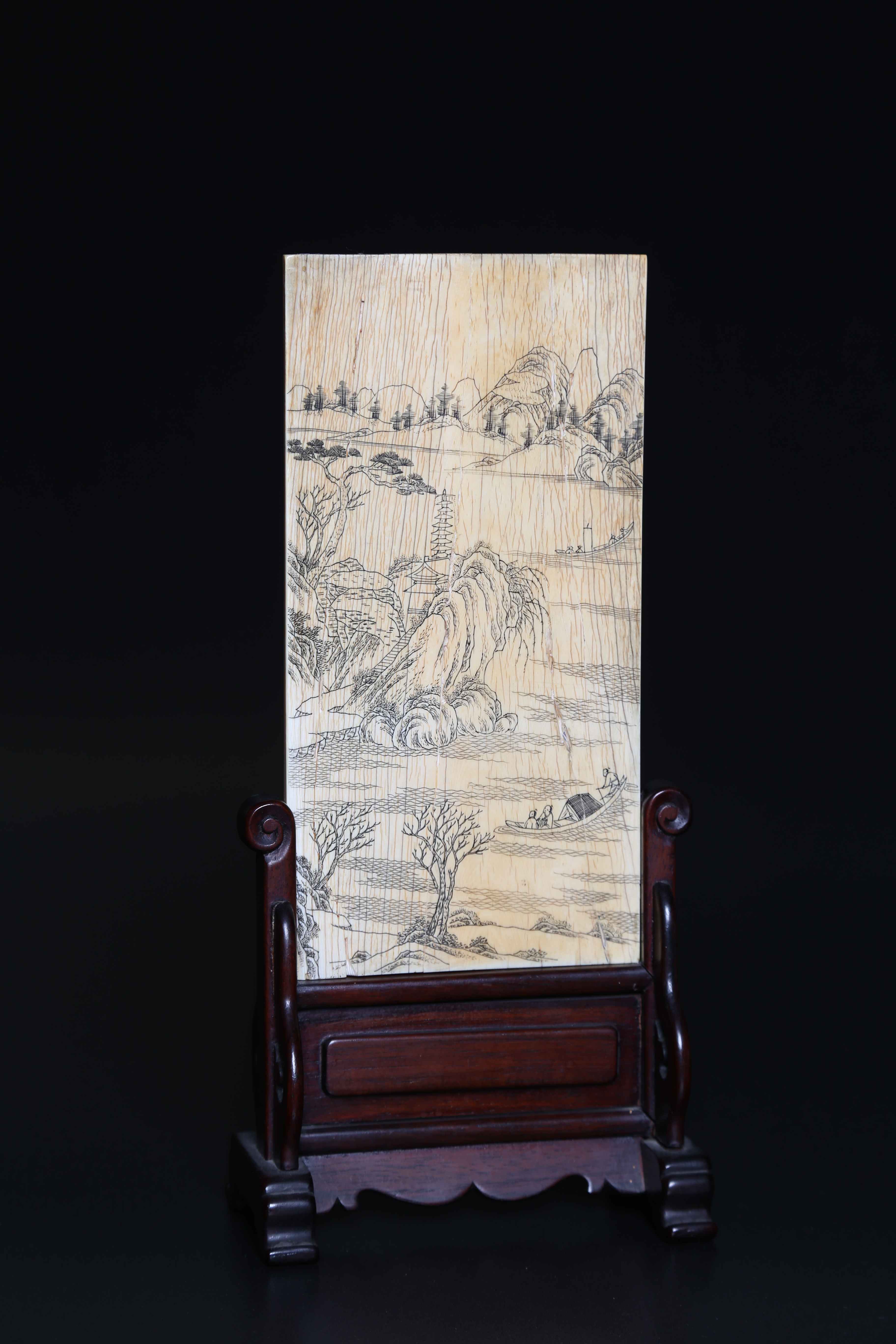 Arte Cinese Piccolo schermo da tavolo rettangolare in avorio con paesaggio Cina, dinastia Ming. -. . Placca in avorio incisa con raffigurazione di un paesaggio montuoso e lacustre con piccola pagoda e coppia di barche con pescatori. L'oggetto mostra una lunga incisione sul retro ed un'elaborata base in legno. Piccole aperture e filature nell'avorio.