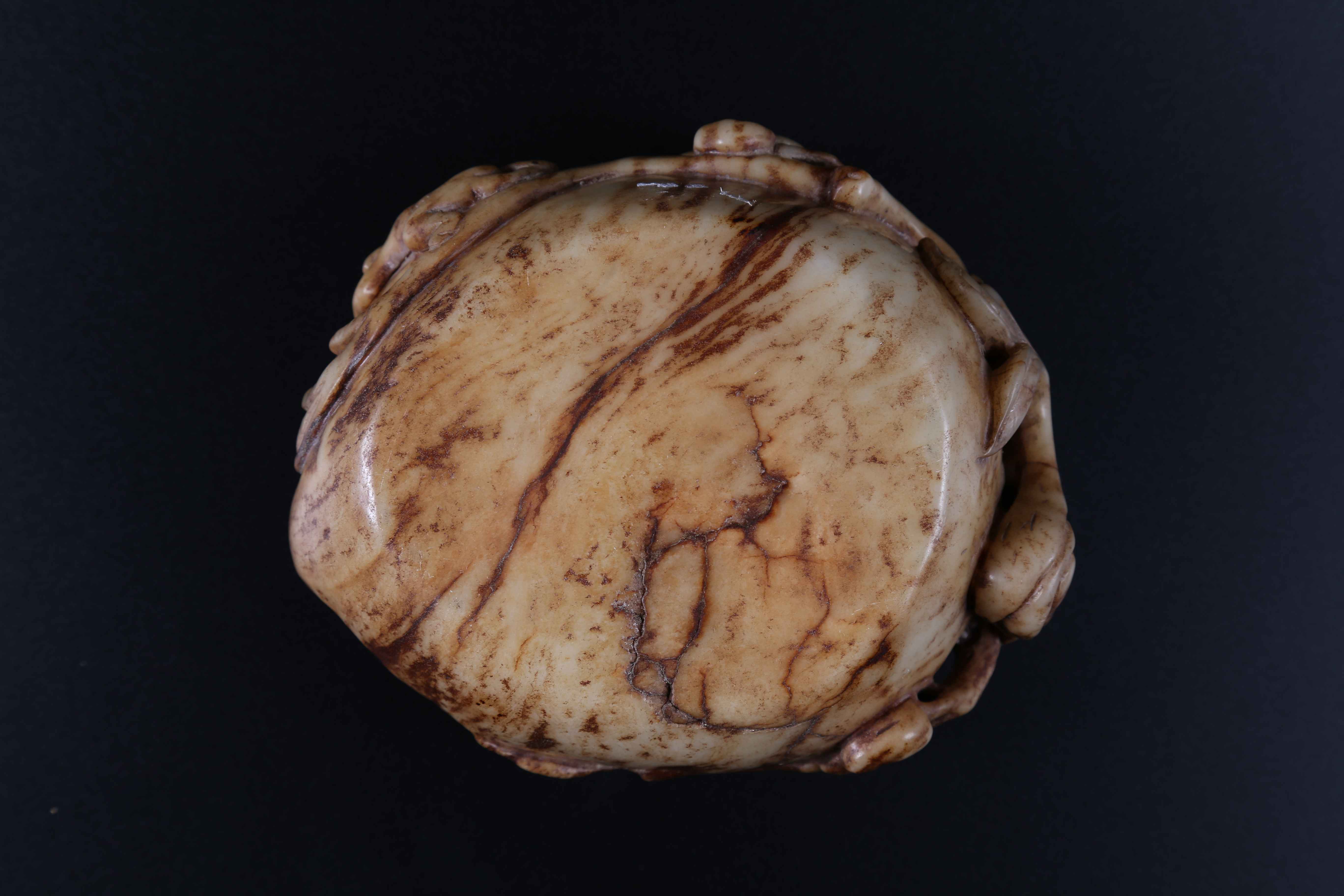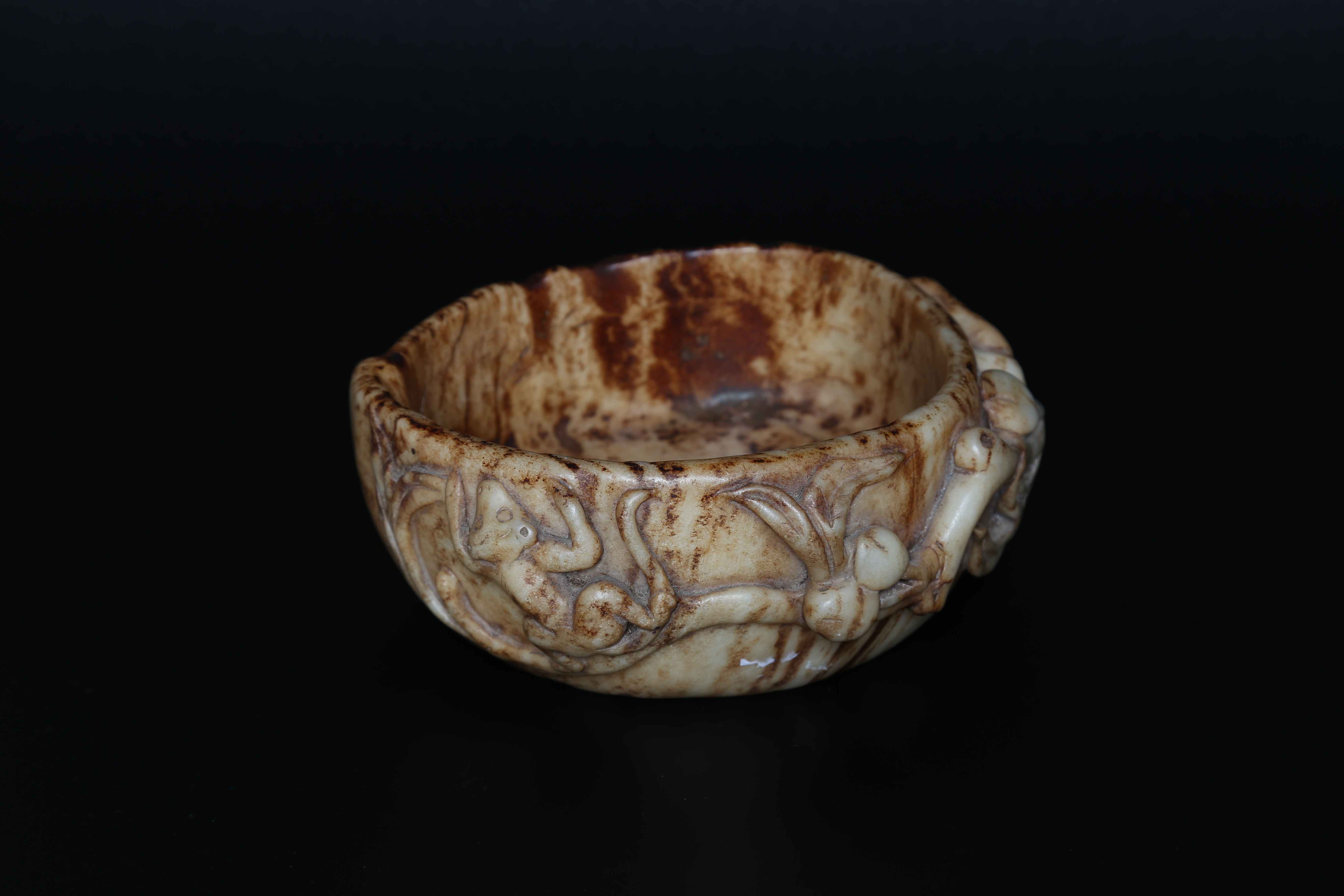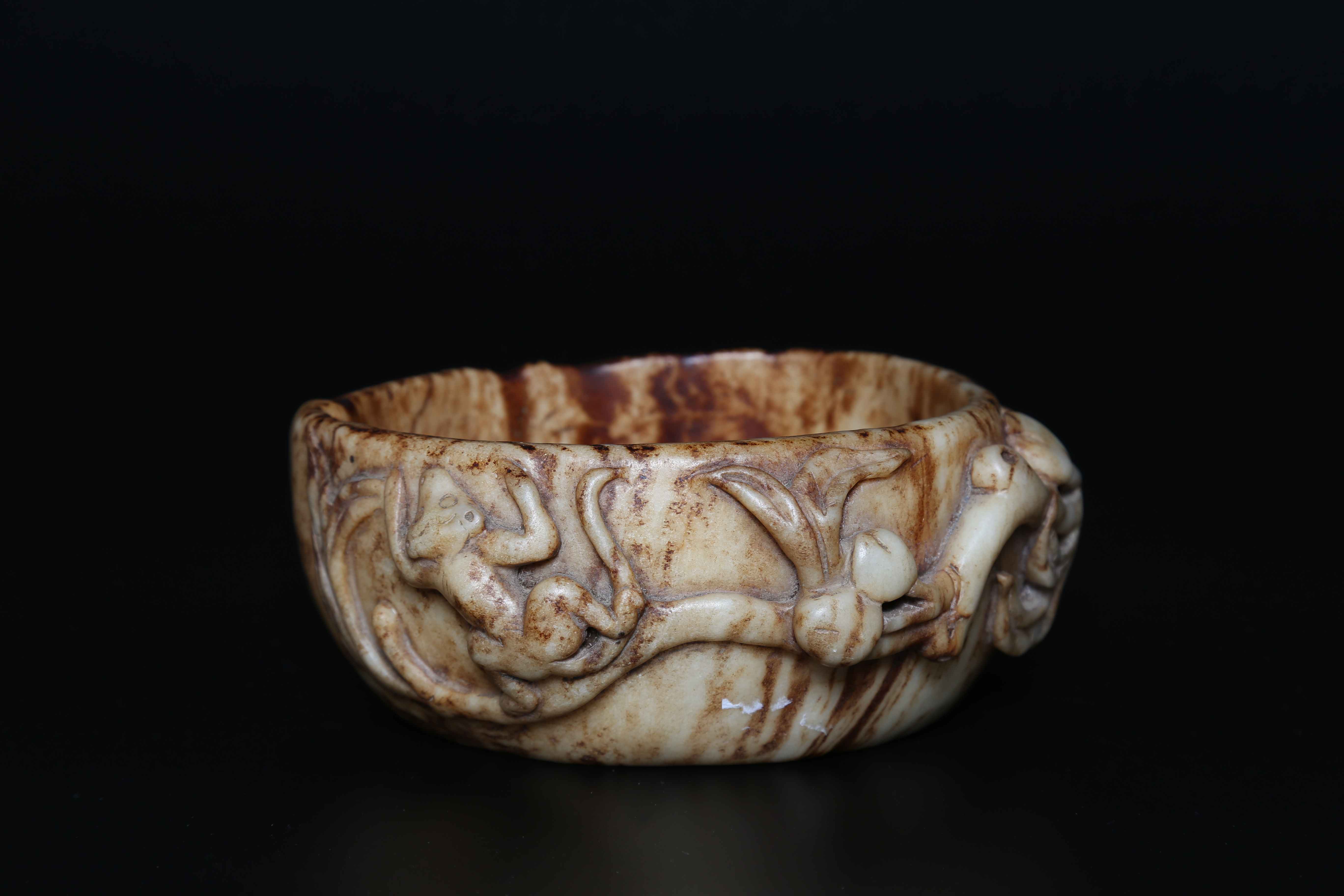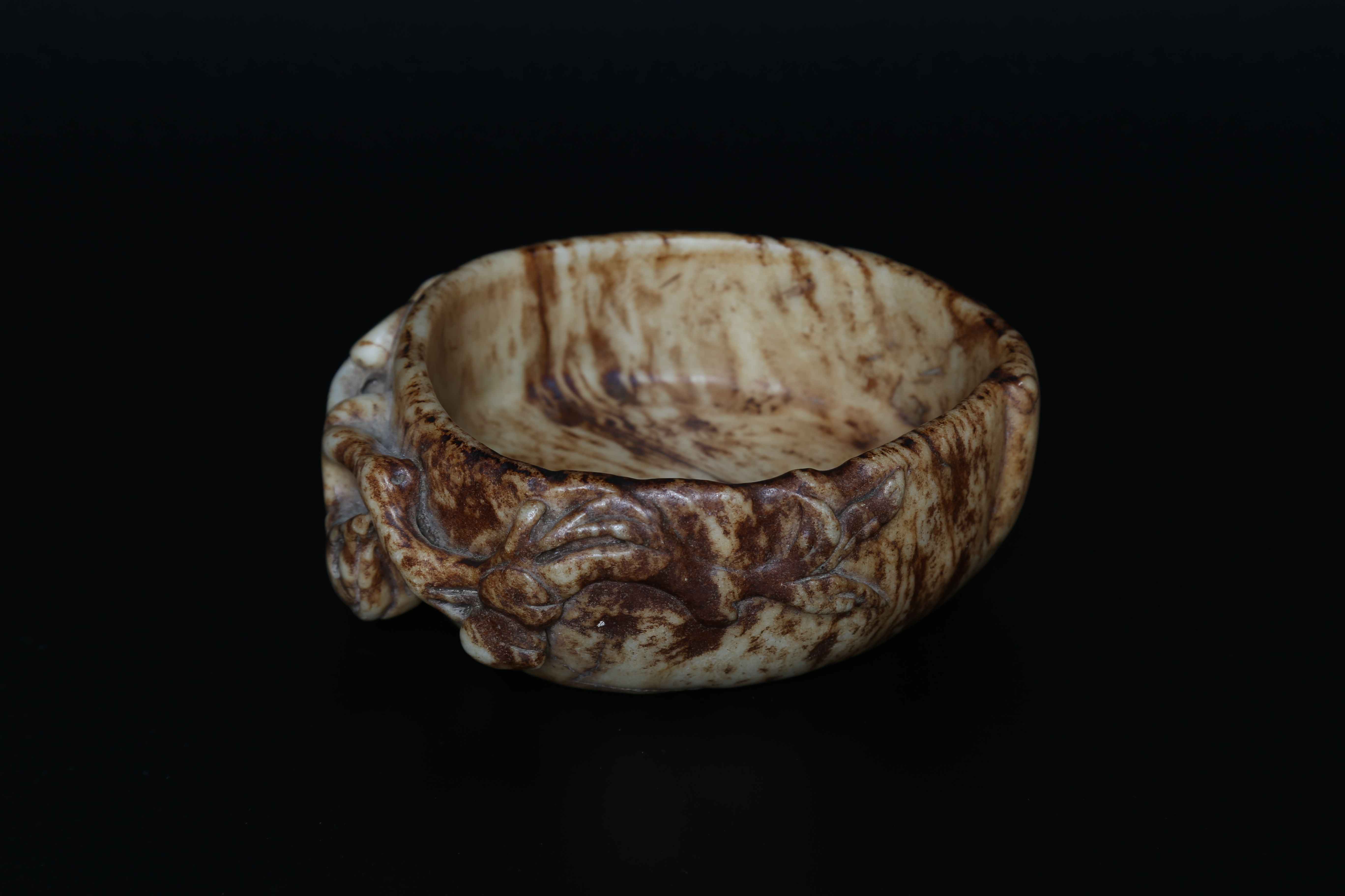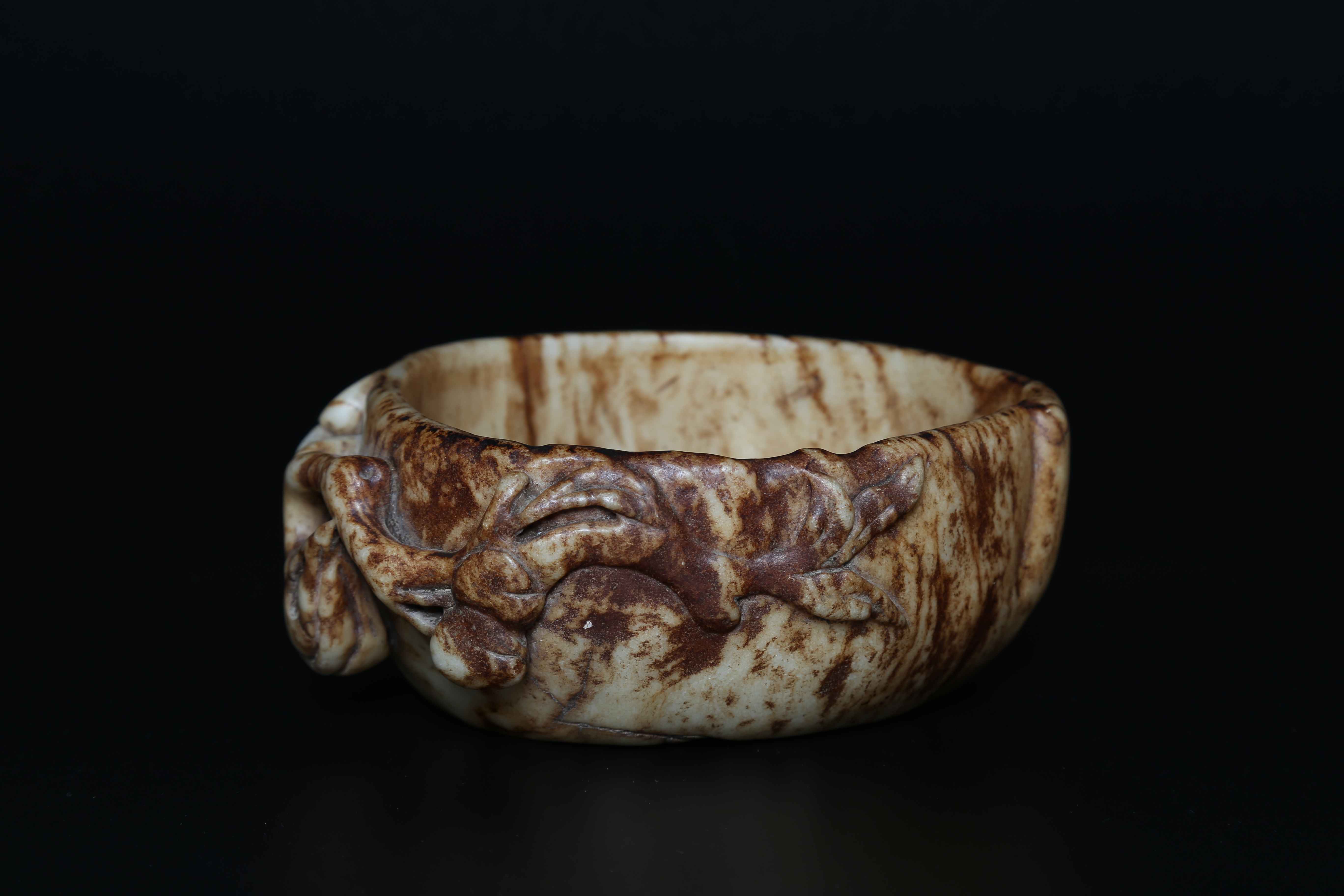 Arte Cinese Coppa Ming in giada Cina, XVII secolo. -. Cm 14,00 x 6,00. Coppa in giada marezzata decorata con rilievi vegetali, che fungono anche da impugnatura, su un lato.