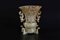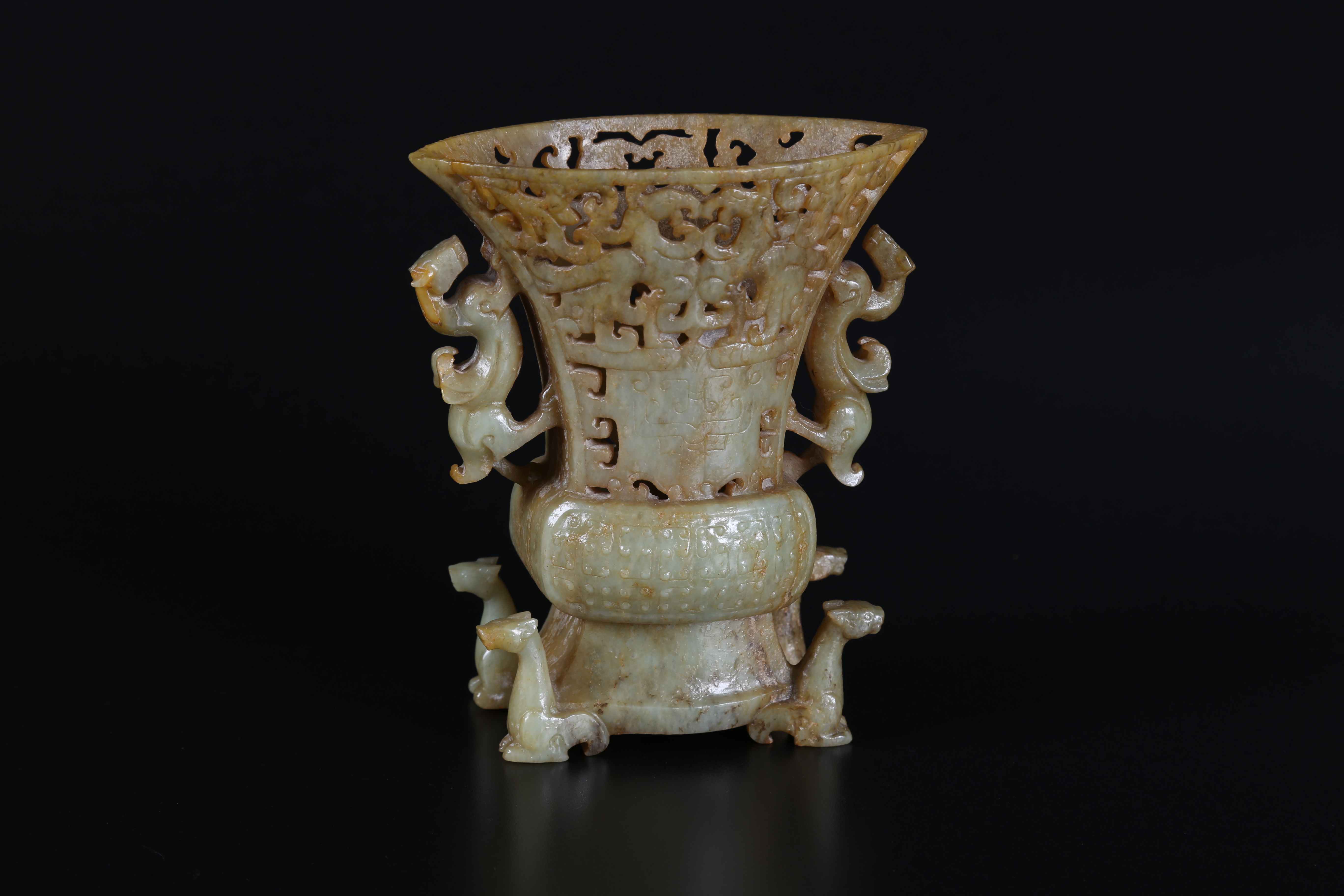 Arte Cinese Contenitore in giada intagliata a traforo Cina, XVIII secolo. -. Cm 13,00 x 15,70. Bel contenitore in giada marezzata caratterizzato da un'alta base sostenuta da quattro leoni e terminante con un rigonfiamento puntinato sul quale si innesta il contenitore a forma di clessidra finemente intagliato a traforo a produrre motivi vegetali intrecciati e due quadrupedi affrontati nella zona centrale superiore, mentre in quella inferiore di entrambe le facce campeggia un taotie in stile arcaico. Le due anse sono sagomate in forma di chilong.