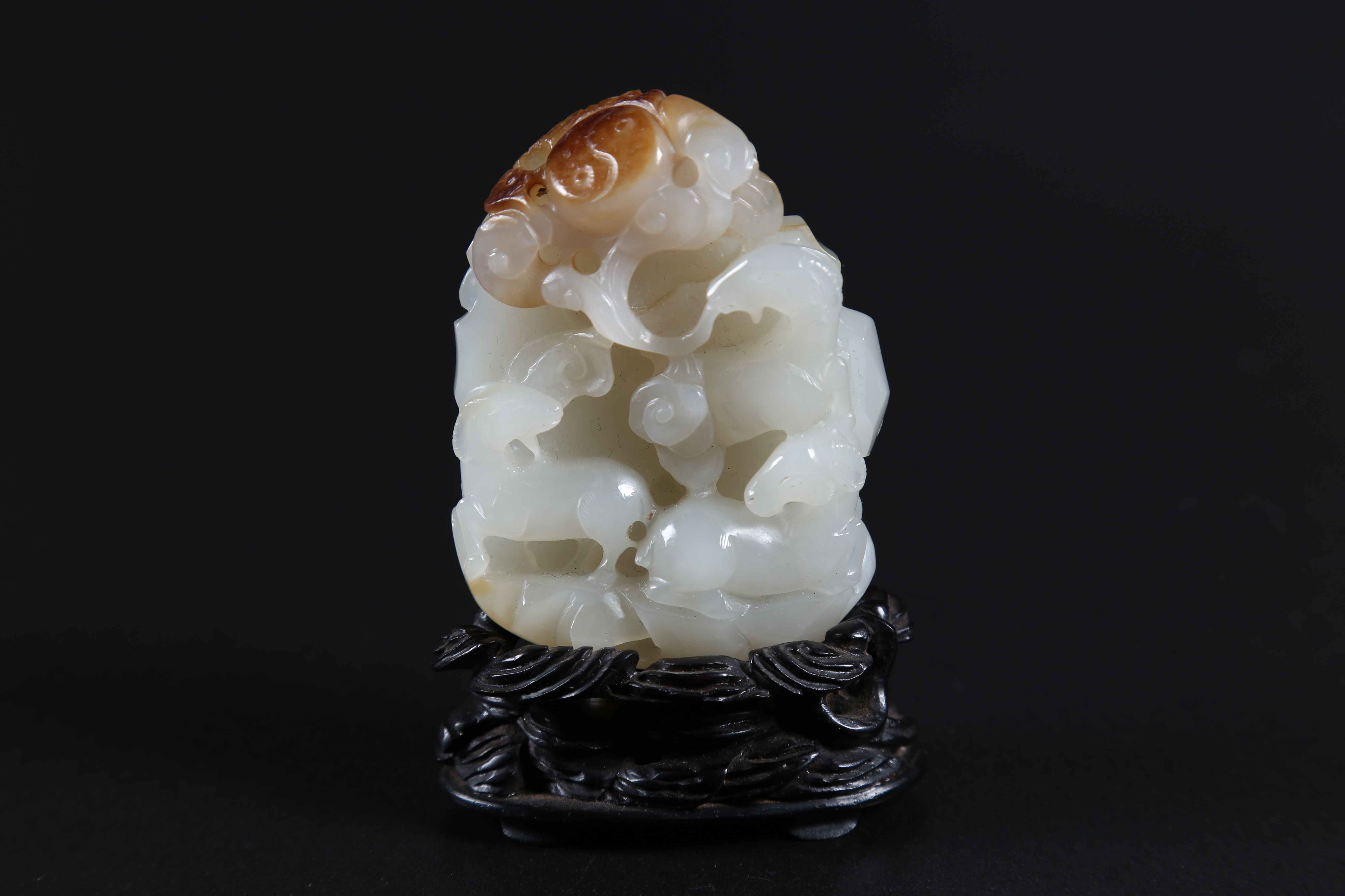 Arte Cinese Intaglio in giada chiara screziata raffigurante degli arieti ed un pino cinese Cina, XIX secolo. -. Cm 5,00 x 6,70. L'oggetto è corredato dal supporto in legno scuro e l'altezza totale risulta di 8 cm
