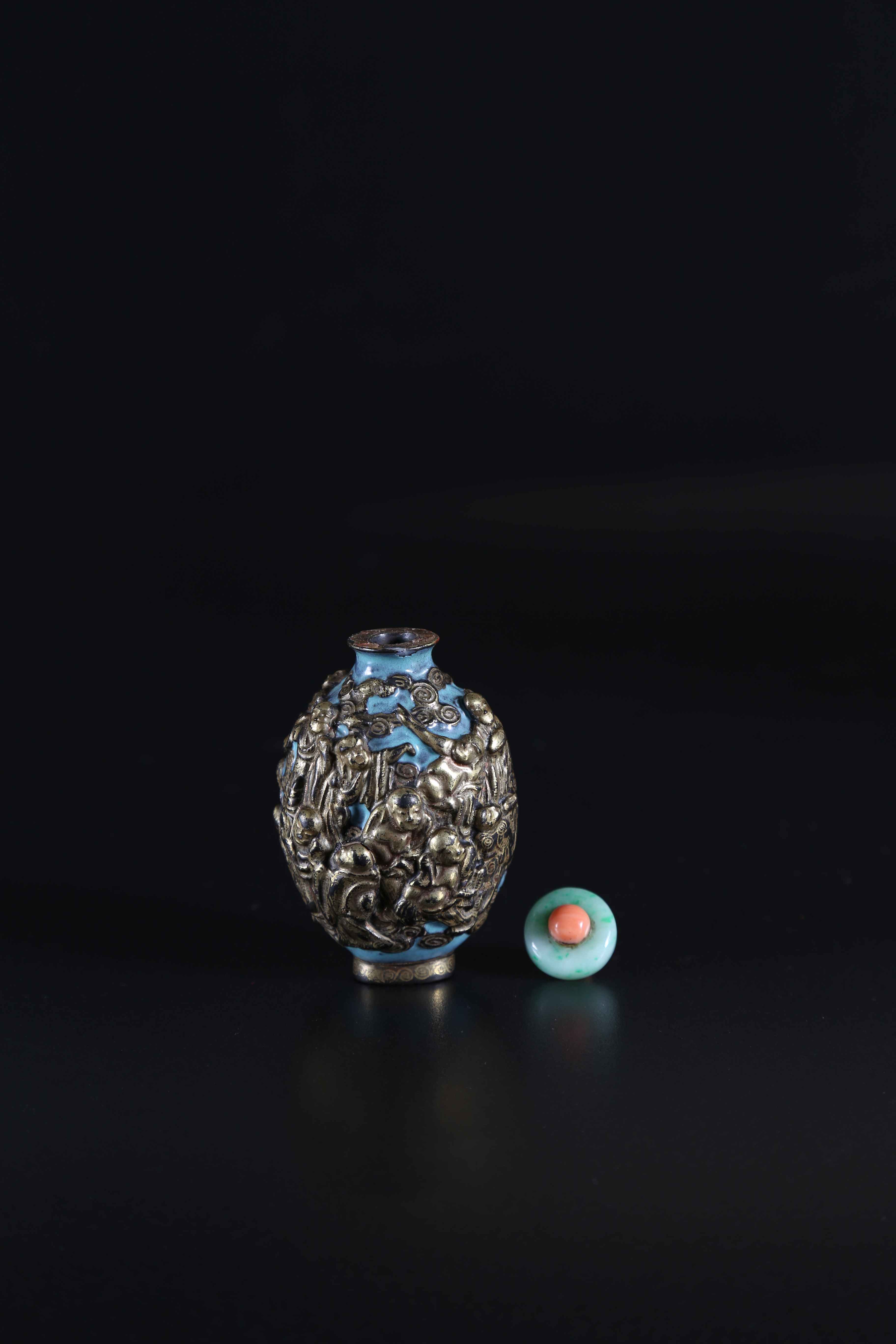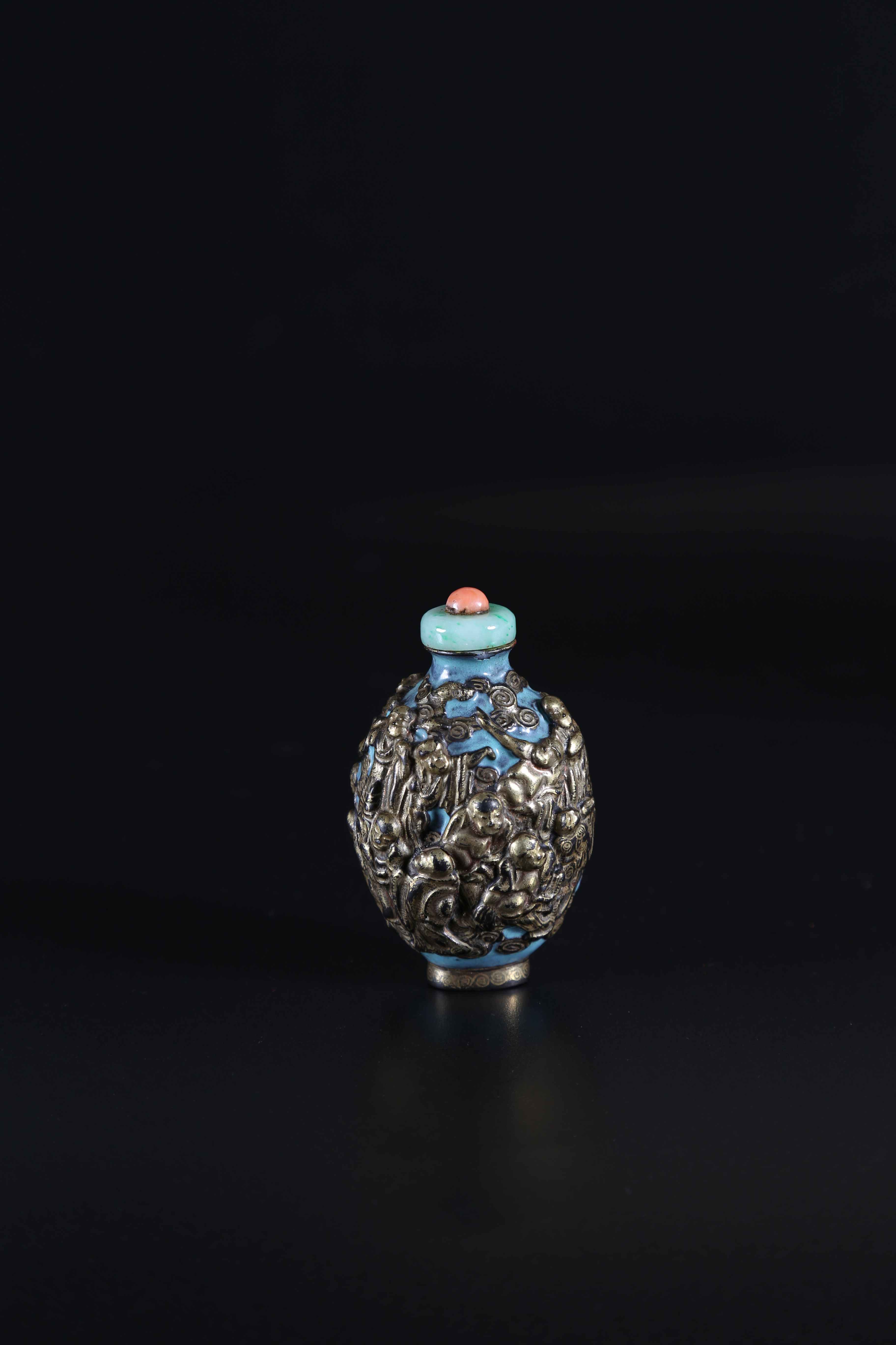 Arte Cinese Tabacchiera Robin's egg decorata con rilievo dorato raffigurante gli immortali