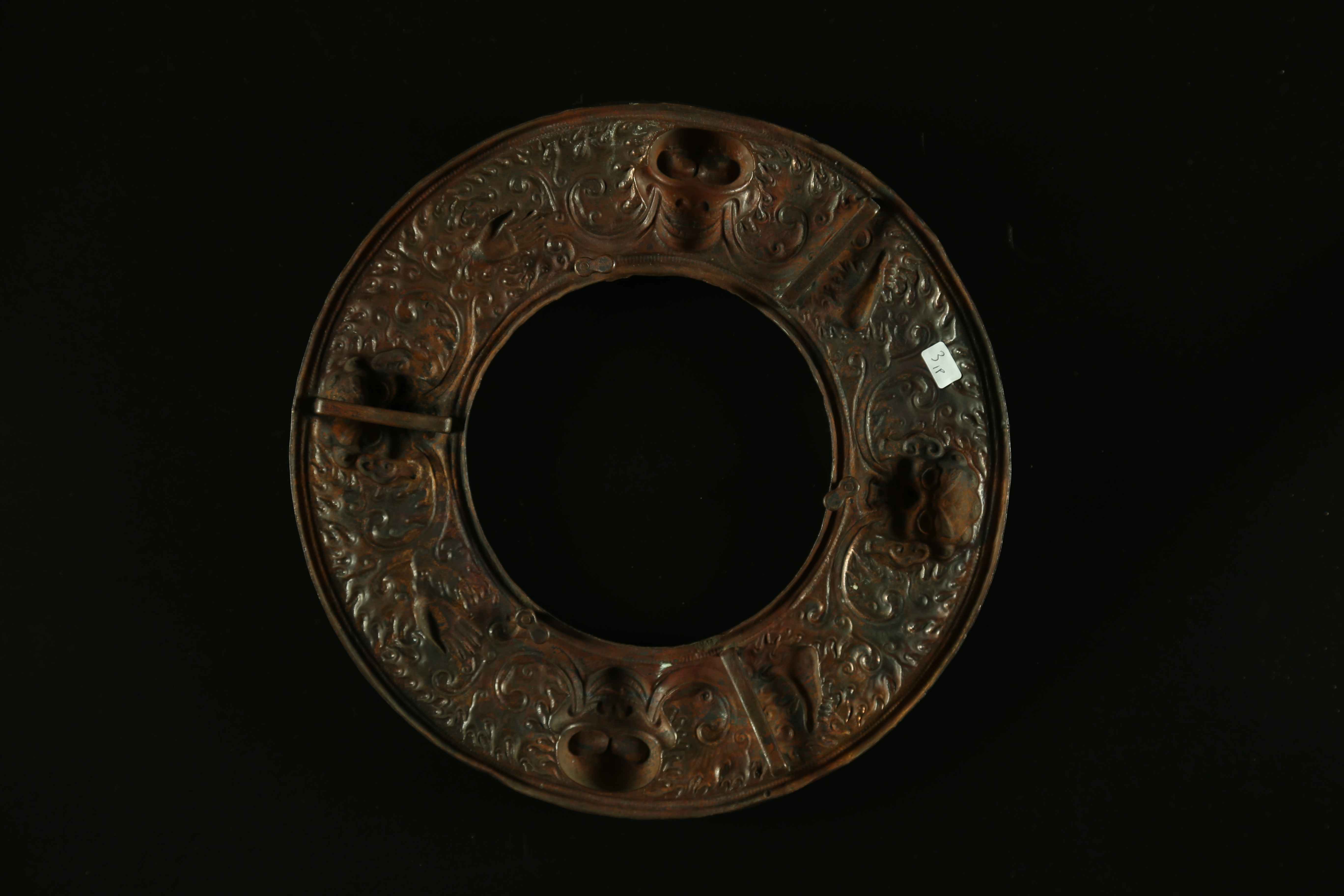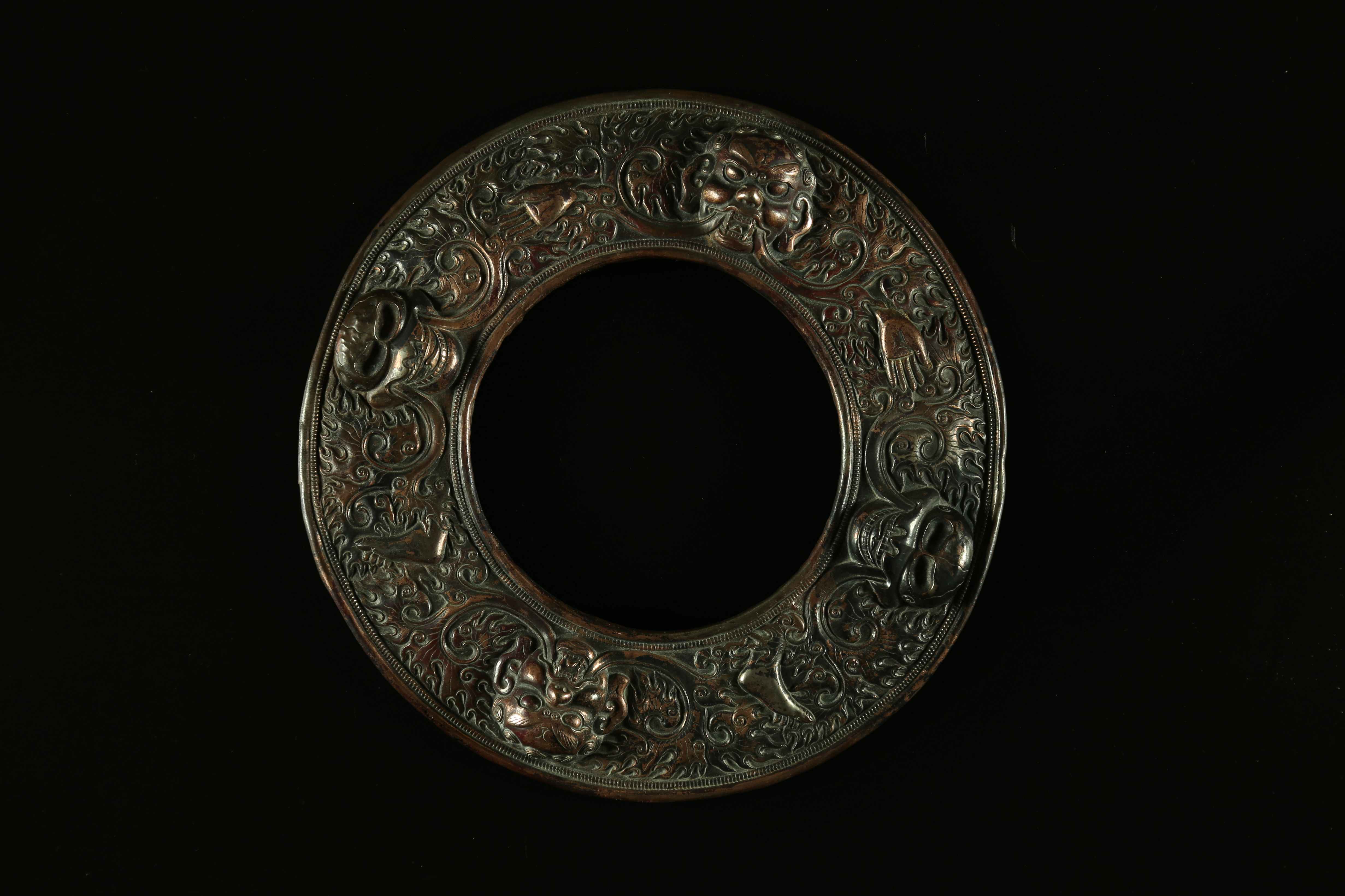 Tibet, XIX secolo. -. Cm 27,70. Grande cornice di specchio da oracolo decorata con offerte feroci e fiamme.