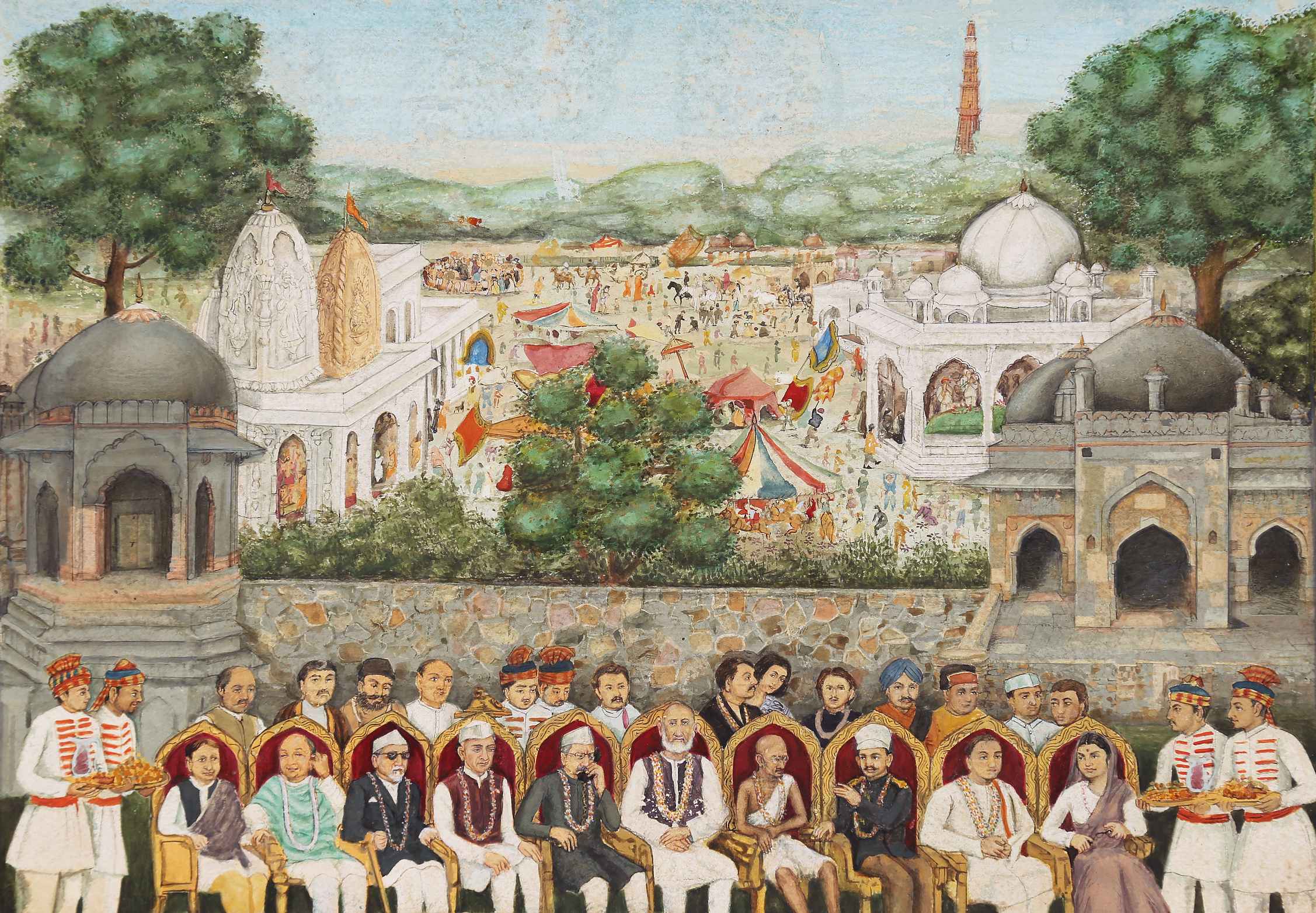 India, seconda metà XX secolo. -. Cm 33,00 x 23,00. Grande miniatura nello stile company school raffigurante i festeggiamenti per l'indipendenza. Una cinta muraria con due edifici simmetrici alle estremità divide in due il dipinto: la parte alta mostra il giubilo popolare, mentre in basso due file ordinate ospitano i capi di stato e personaggi illustri, tra cui Gandhi, riuniti.
