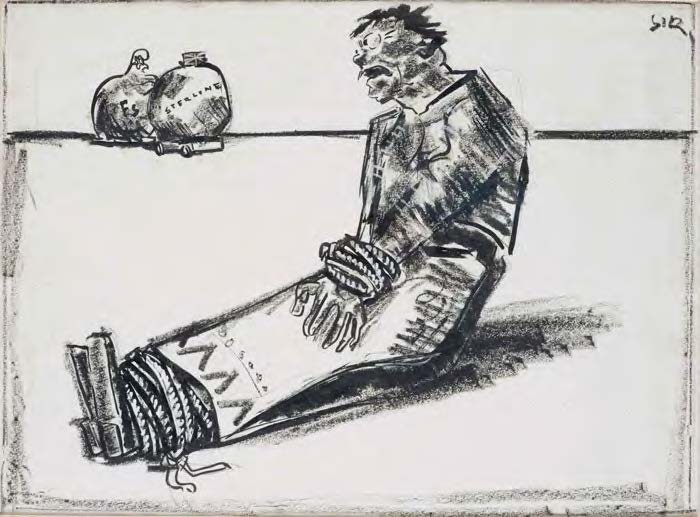MARIO SIRONI Sassari 1885 - Milano 1961 ALLEGORIA DELLA POLITICA tecnica mista su carta, cm 32x43. Firmato in alto a sinistra: SIR Iscritto sul margine inferiore a grafite: La Romania: Ma questa non è garanzia, è schiavitù. I due: Già, la garanzia della vostra schiavitù. Bibliografia: F. Benzi-A. Sironi, Sironi Illustratore, catalogo ragionato, De Luca Edizioni d’Arte, Roma 1988, p. 127, n. 1150, riprodotto.