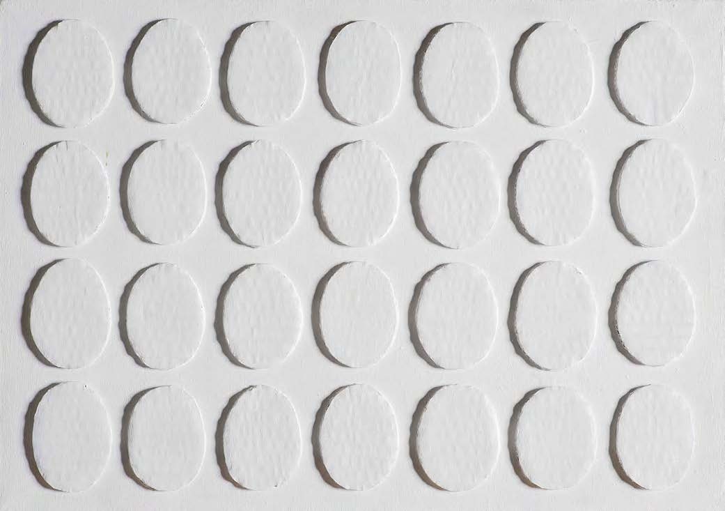 TURI SIMETI Alcamo 1929 28 OVALI BIANCHI, 1962 collage di cartoni su tela, cm 35x50. Firmato e datato al verso sul telaio: Simeti 1962 Provenienza: Opera acquistata dall’attuale proprietario direttamente dall’artista. Opera registrata dall’Archivio Turi Simeti con il numero 1962-B0352 a cura della Galleria Dep Art in Milano.