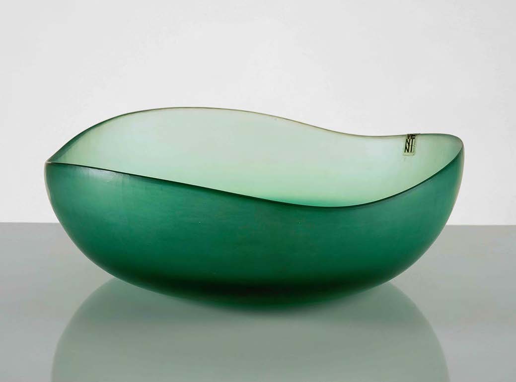 TOBIA SCARPA Ciotola in vetro verde interamente battuta alla mola. 1982, diametro cm 28,5 e altezza cm 9,50. Reca etichetta Venini.
