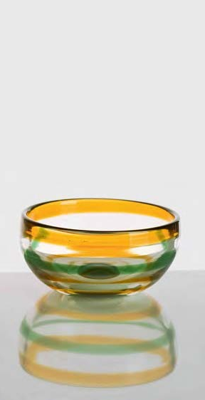 VENINI Piccola coppa in vetro a fasce orizzontali policrome. diametro cm 10,5 e altezza cm 5. Firma incisa: Venini Italia
