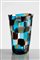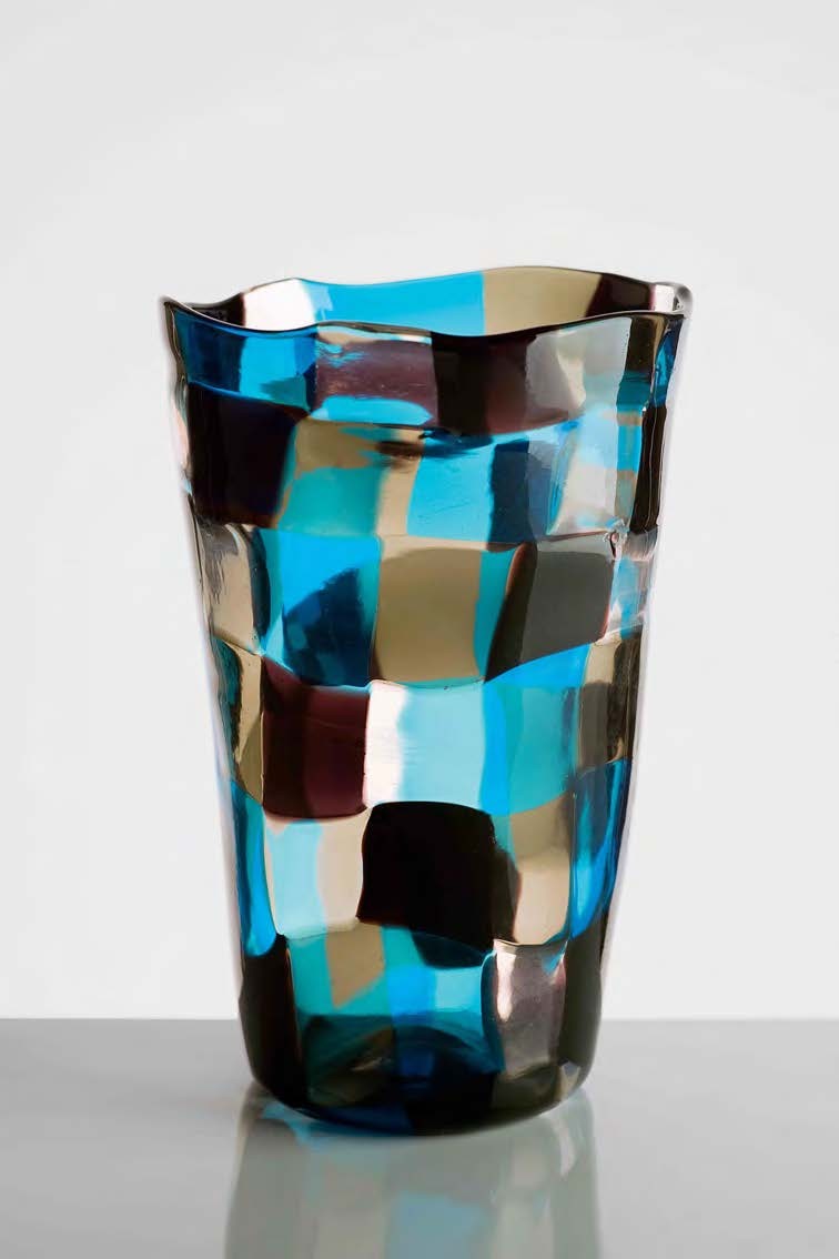 FULVIO BIANCONI Vaso “Pezzato” di forma troncoconica in vetro soffiato e lavorato a mano con tessere policrome acquamare, viola, cristallo e nero. altezza cm 25. Firma all’ acido: Venini Murano