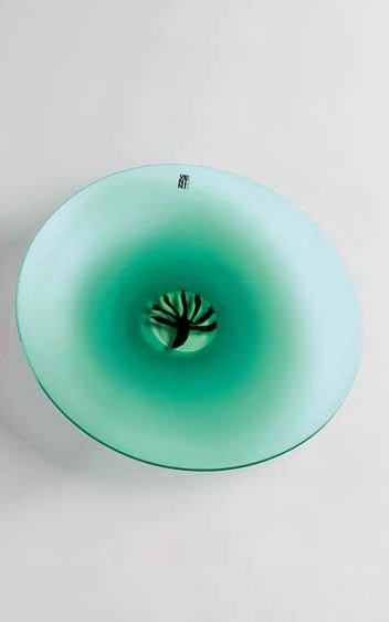 LAURA DE SANTILLANA Primavera, colore verde con grande murrina verde/cristallo al centro con albero stilizzato. diametro cm 35,5. Firma incisa: Venini Italia Laura 100/89 Reca etichetta Venini.