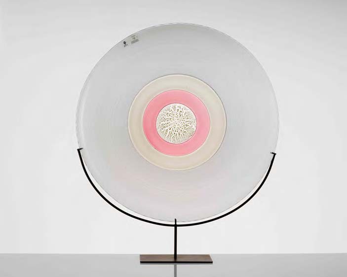 TAPIO WIRKKALA Piatto in vetro soffiato e lavorato a mano in filigrana a tre incalmi lattimo/ciclamino/foglia d’oro. 1981, diametro cm 45. Firma incisa: Venini Italia 81 T. W. Reca etichetta Venini.