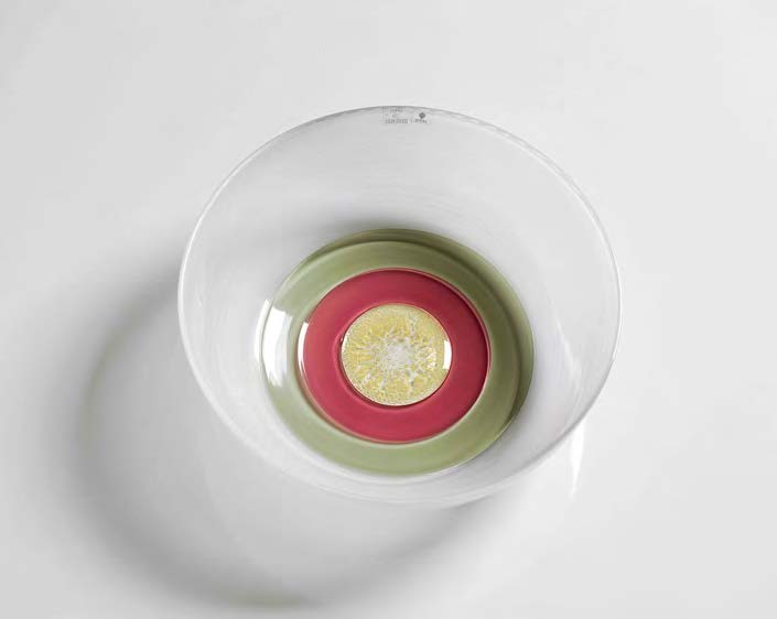 TAPIO WIRKKALA Coppa in vetro soffiato lavorato a mano in filigrana a tre incalmi lattimo/ ciclamino/foglia d’oro. 1981, diametro cm 32,8 e altezza cm 11. Firma incisa: Venini Italia T.W. 81 19/100