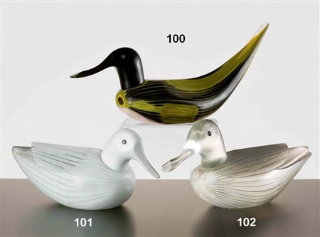 TONI ZUCCHERI Anatra in vetro massiccio bianca e cristallo, con testa scolpita alla mola. lunghezza cm 32, altezza cm 13. Firma incisa: Venini Italia T.Z. 80