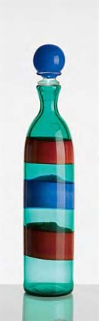 FULVIO BIANCONI e PAOLO VENINI Bottiglia con tappo in vetro soffiato verde con fasce orizzontali rosse e blu. altezza cm 40. Firma incisa: Venini 87 Reca etichetta Venini Murano.
