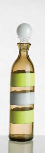 FULVIO BIANCONI e PAOLO VENINI Bottiglia con tappo in vetro soffiato color fumo con fasce orizzontali gialle e bianche. altezza cm 40. Firma incisa: Venini 92 Reca etichetta Venini Murano.