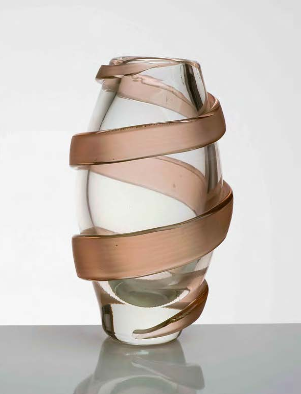 VENINI Vaso in vetro con fascia applicata coclide color tè. altezza cm 31,5. Firma incisa: Venini 1987 Reca etichetta Venini.