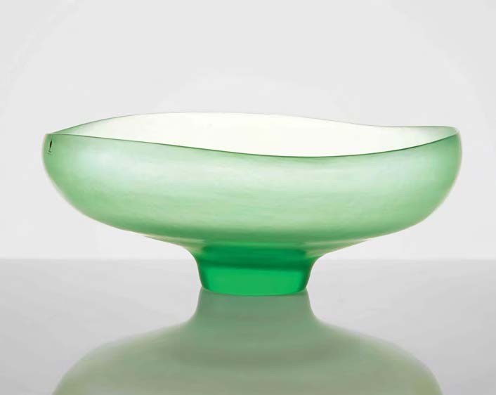 TOBIA SCARPA Grande ciotola in vetro verde interamente battuta alla mola. diametro cm 40. Firma incisa: Venini Italia 80 Reca etichetta Venini.