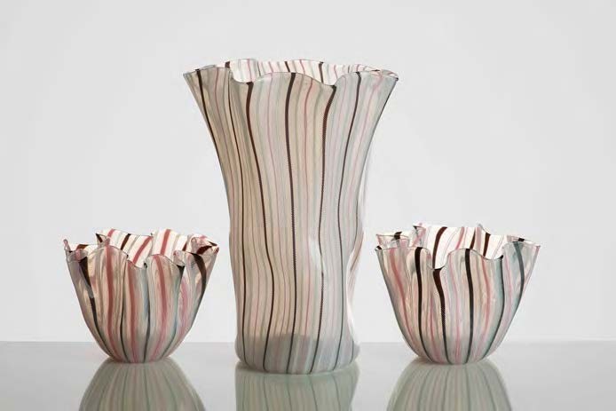 VENINI Lotto composto da 01 vaso fazzoletto e coppia di coppe fazzoletto in vetro a canne e filigrana. Vaso altezza cm 28. Coppe altezza cm 12. Firma all’acido su una coppa: Venini Murano Italia