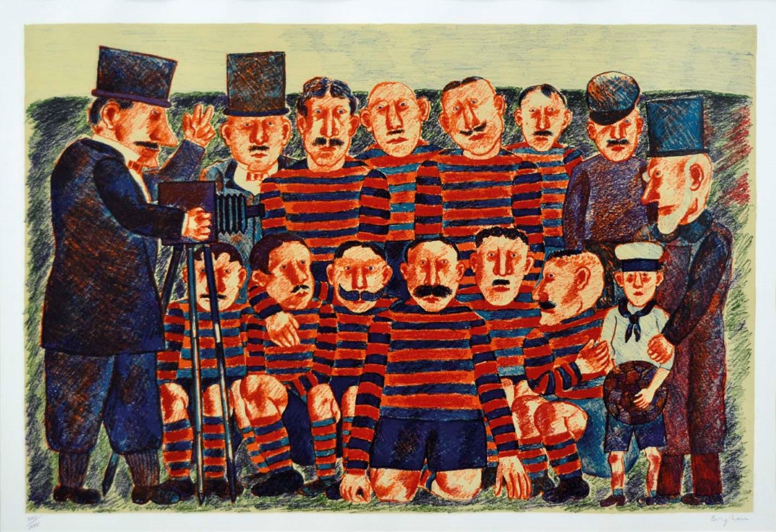 BORGHESE FRANZ Roma 1941 - 2005 Squadra di calcio litografia es. XXV/XXV 50x70 firma in basso a destra tiratura in basso a sinistra