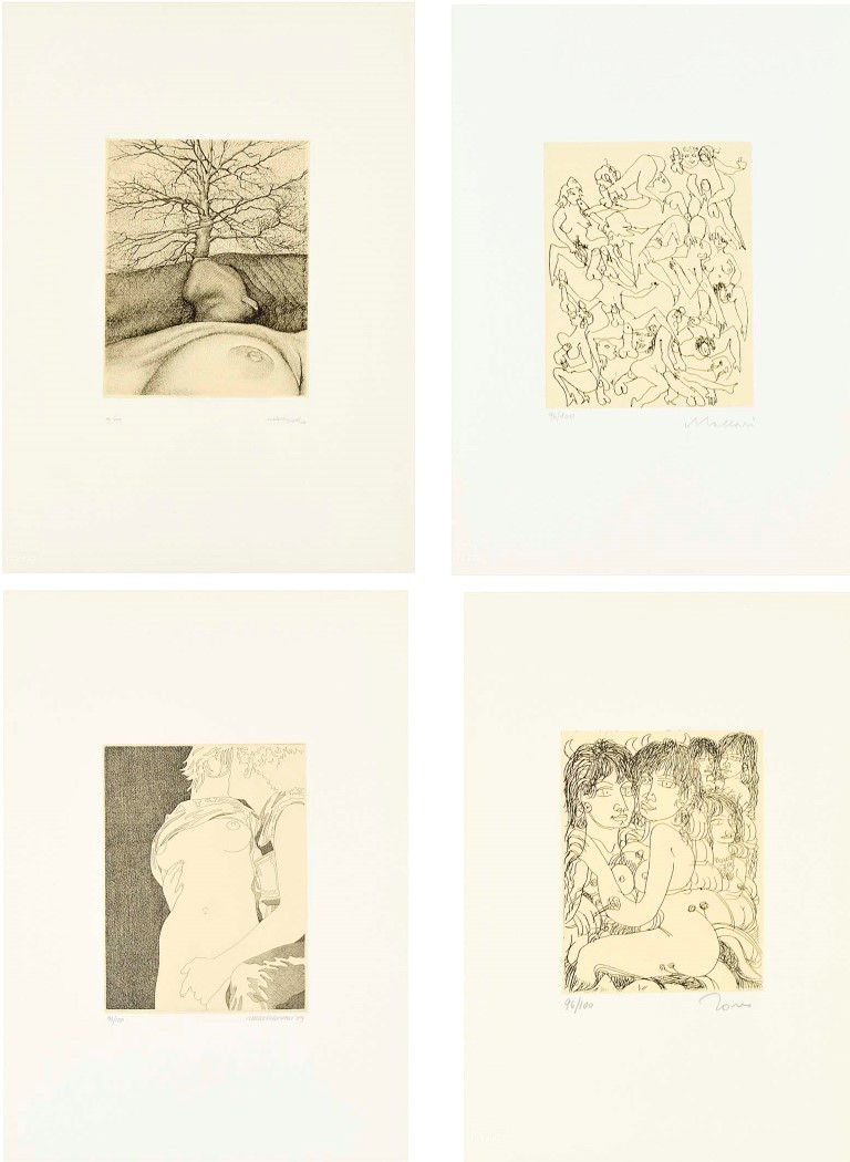 AUTORI VARI Sull' erotismo.....1979 cartella contenente 4 acqueforti su carta cina es. 96/100 16x12(lastra) 25x35(foglio) firma in basso a destra tiratura in basso a sinistra Mino Maccari, Attilio Steffanoni, Peter Willburger, Tono Zancanaro a cura di Mario Stefani