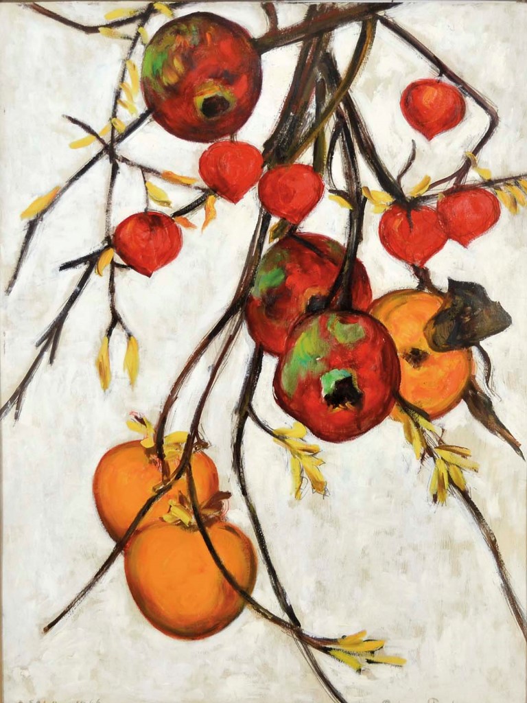 POTENZA PRIMO Venezia 1909 - 1983 Cachi e melagrani composizione 1966 olio su faesite 75x55 firma in basso a destra data in basso a sinistra