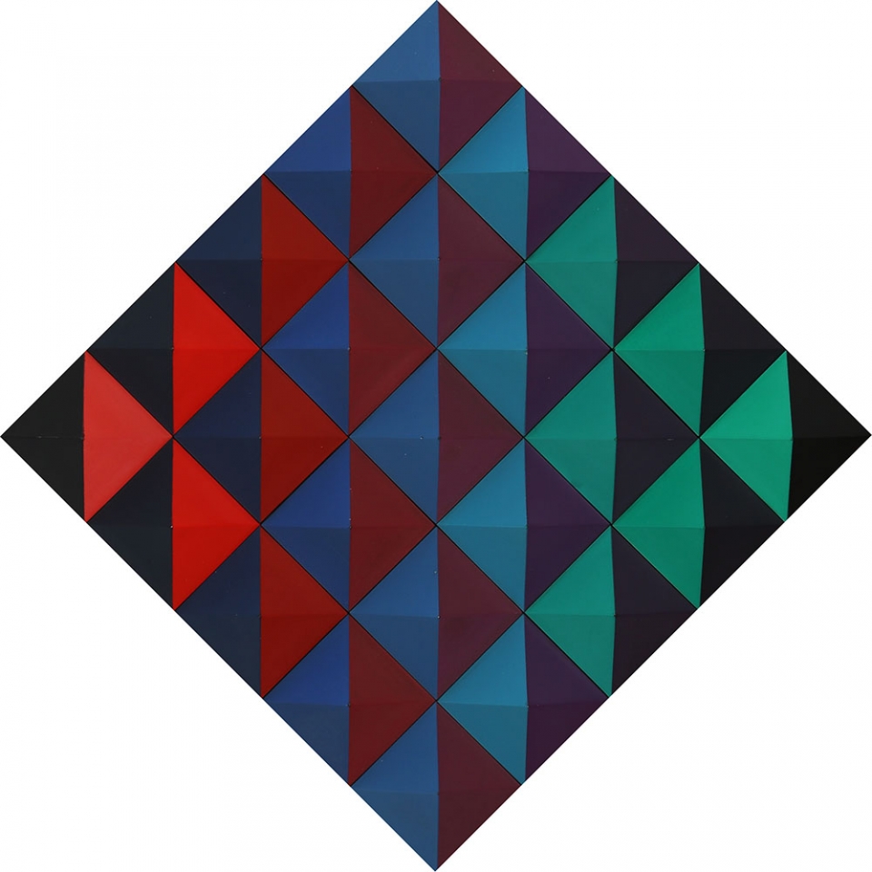 HANS JORG GLATTFELDER, 1939, Mir 195, 1981, Rilievi con piramidi, cm. 25 x 25 x 3, Firmato e datato sul retro, Timbro dell’artista sul retro, Timbro Studio F22 Palazzolo sul retro, Prov. Collezione Privata,