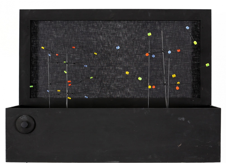 HUGO DEMARCO, 1932 - 1995, Vibrations, Assemblaggio, box in legno, neon, ferro e, plastiche colorate con motore, cm. 60 x 80 x 26, Firmato sul retro, Autenitica di Amalia Demarco su fotografia, Opera realizzata da un progetto del 1969, Opera n. 4/5, Prov. Collezione Privata,
