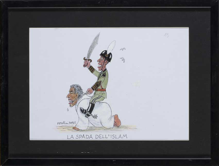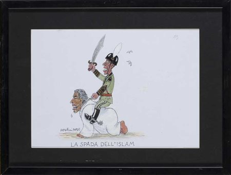 Originali "La spada dell'Islam, Obama e Gheddafi" 2011 disegno a pennarello a colori. In cornice (cm 20x30)