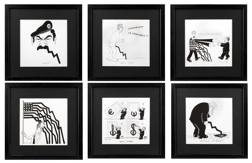 Originali "L'America e Wall Street" sei litografie con interventi a mano dell'artista in bianco e nero. In cornici