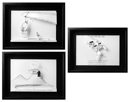 "Tre decenni di politica italiana" gruppo di tre cartoncini in 3D in bianco e...