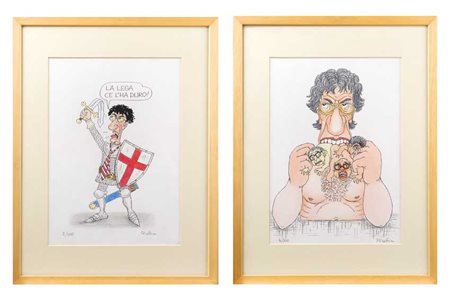 "La Lega ce l'ha duro" due litografie con intervento a mano a colori,...