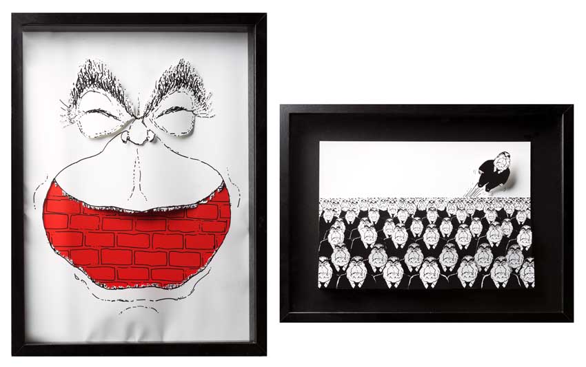 "Leonid Breznev" due cartoncini in 3D in bianco e nero e a colori contenuti in teca (cm 30x40)