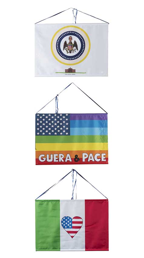 "Bandiere: The Black House, Guera e pace, Italia-USA" gruppo di tre stendardi (cm 50x70)