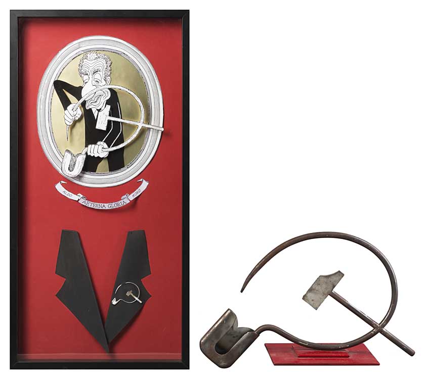 Reliquiario "Aldo Moro" (cm 70x30) e scultura in ferro "Spilla falce e martello" (cm 25x40) a colori