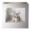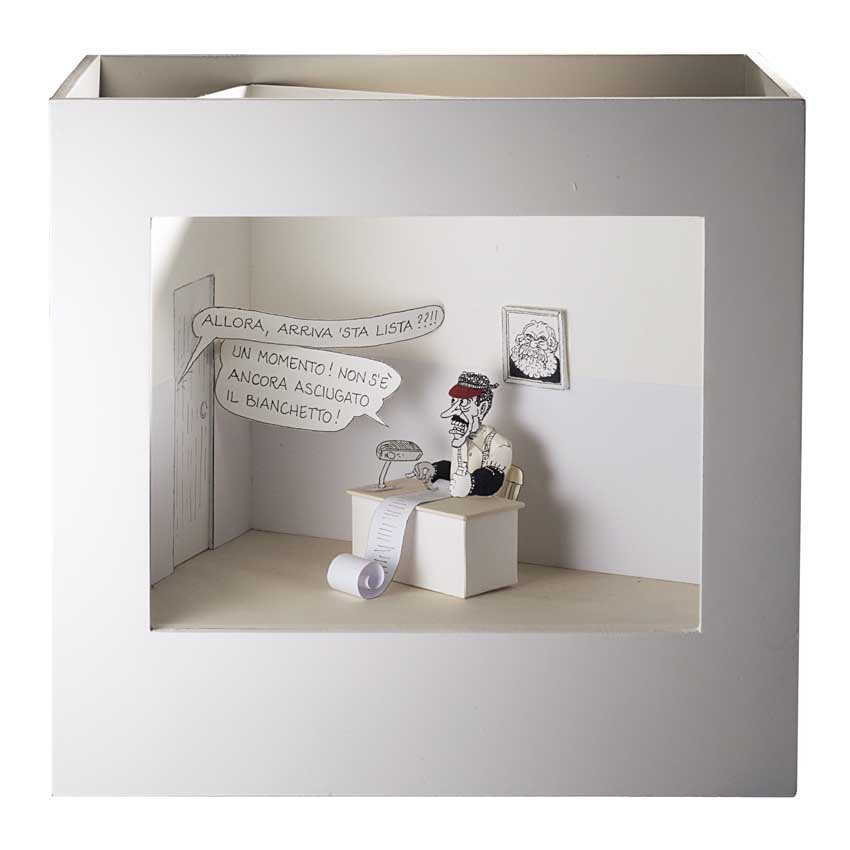 "Vignetta del bianchetto. Massimo D'Alema e l'affare Mitrokhin", teatrino in carta contenuto in teca di legno e vetro, 1999 (cm 45x42x16,5)
