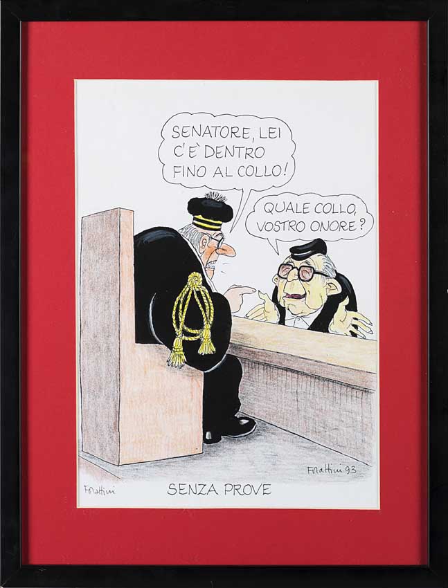 Originali "Giulio Andreotti in tribunale" 1993 litografia con intervento a mano dell'artista a colori. In cornice (cm 20x30)