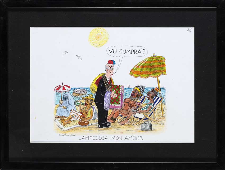 Originali "Napolitano: Lampedusa mon amour" 2011 tecnica mista a colori su base litografica. In cornice (cm 30x20)