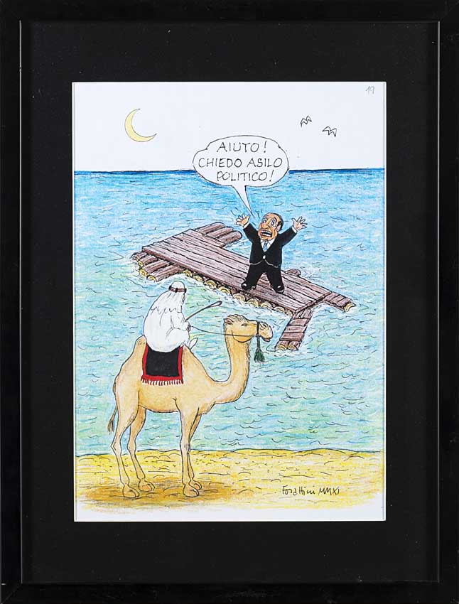 Originali "Silvio Berlusconi e l'asilo politico" 2011 tecnica mista su base litografica a colori. In cornice (cm 30x20)