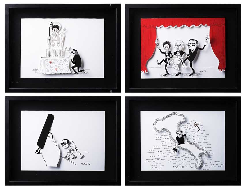 "Il governo della non sfiducia", "Berlinguer, Paolo VI e Andreotti", "Il governo dell'astensione", "Fanfani butta le chiavi", 1974 - 1975, gruppo di quattro cartoncini in 3D contenuti in teca (cm 20x30)
