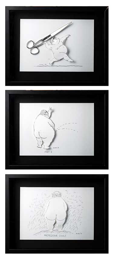 "L'era Spadolini" gruppo di tre cartoncini in 3D in bianco e nero contenuti in teca (cm 20x30)