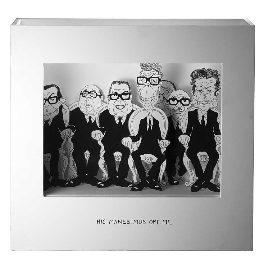 "Hic manemibus optime" personaggi vari, teatrino in carta contenuto in teca di legno e vetro, 1980 (cm 45x42x12)