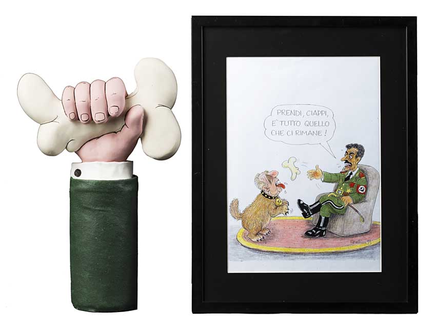Originali "Ciampi - D'Alema" litografia con intervento a mano dell'artista a colori unito ad una scultura inerente la vignetta (cm 30x20); "Carlo Azeglio Ciampi- Ciappi, eletto Presidente della Repubblica" 1999