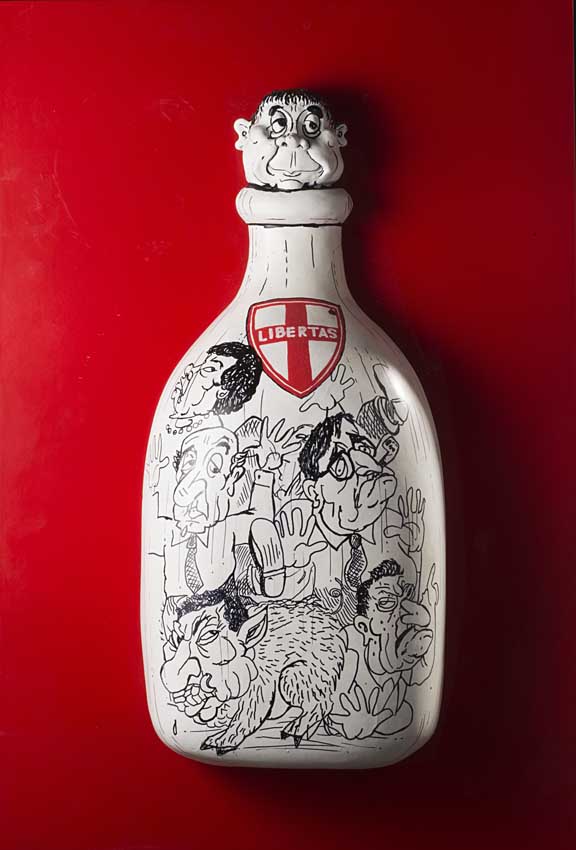 "Rocco Buttiglione e gli imbottigliati" scultura in cartapesta montata su pannello in legno (cm 50x33)