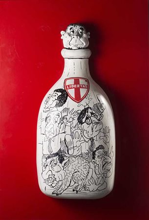 "Rocco Buttiglione e gli imbottigliati" scultura in cartapesta montata su...