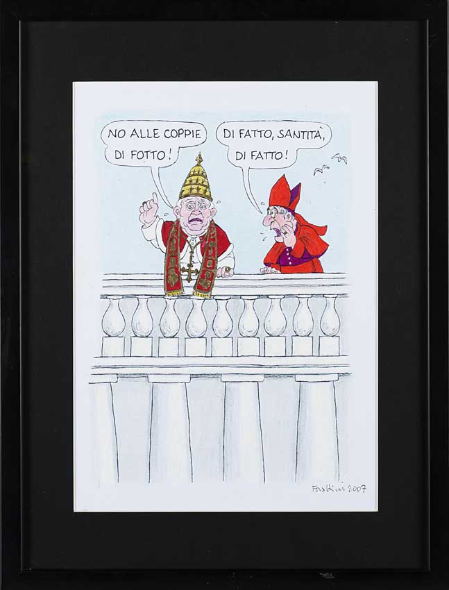 Originali: "Papa Ratzinger e le coppie di fatto" 2007 litografia con intervento a mano dell'artista a colori. In cornice (cm 30x20)