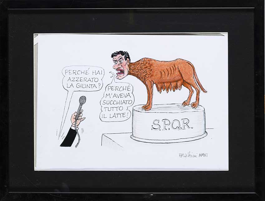 Originali "Il sindaco Alemanno azzera la giunta capitolina" 2011 tecnica mista a colori su base litografica. In cornice (cm 20x30)