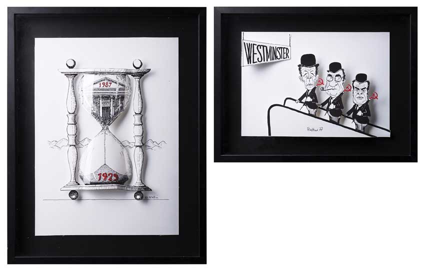 "L'eurocomunismo al Congresso laburista" 1977; "Il crollo di Wall Street 1929" 1987, due cartoncini in 3D a colori contenuti in teca